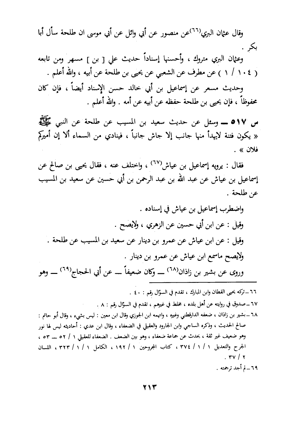وَعُثْمَانُ الْبُرِّيُّ مَتْرُوكٌ، وَأَحْسَنُهَا إِسْنَادًا حديث علي بن مسهر، ومن تَابَعَهُ، عَنْ مُطَرِّفٍ، عَنِ الشَّعْبِيِّ، عَنْ يَحْيَى بْنِ طَلْحَةَ، عَنْ أَبِيهِ، وَاللَّهُ أَعْلَمُ.