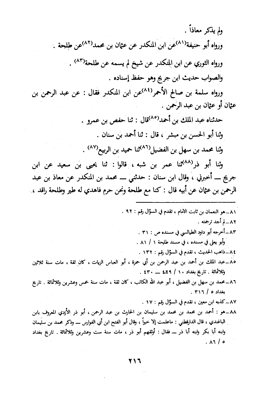وَرَوَاهُ أَبُو حَنِيفَةَ، عَنِ ابْنِ الْمُنْكَدِرِ، عَنْ عُثْمَانَ بْنِ مُحَمَّدٍ، عَنْ طَلْحَةَ.