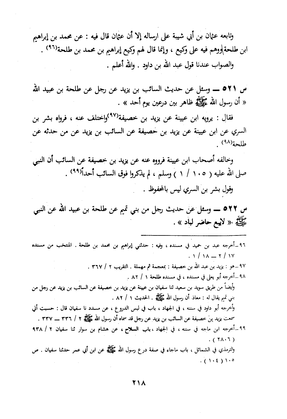 521- وَسُئِلَ عَنْ حَدِيثِ السَّائِبِ بْنِ يَزِيدَ، عَنْ رَجُلٍ، عَنْ طَلْحَةَ بْنِ عُبَيْدِ اللَّهِ أَنَّ رَسُولَ اللَّهِ صَلَّى اللَّهُ عَلَيْهِ وَسَلَّمَ ظَاهَرَ بَيْنَ دِرْعَيْنِ يَوْمَ أُحُدٍ.