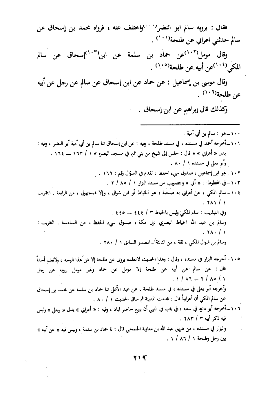 وَقَالَ مُؤَمَّلٌ، عَنْ حَمَّادِ بْنِ سَلَمَةَ، عَنِ ابْنِ إِسْحَاقَ، عَنْ سَالِمٍ الْمَكِّيِّ، عَنْ أَبِيهِ، عَنْ طَلْحَةَ.