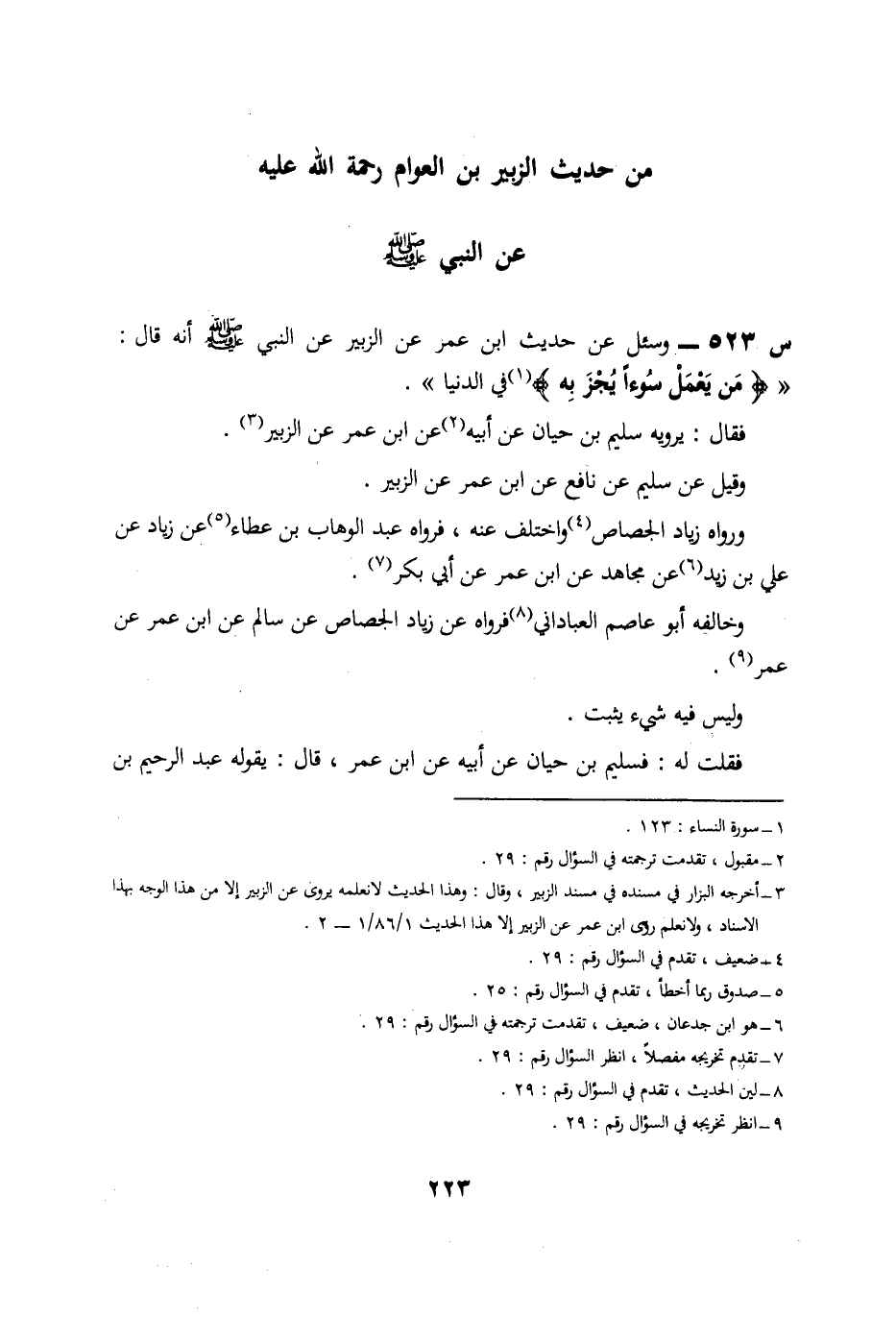 523- وَسُئِلَ عَنْ حَدِيثِ ابْنِ عُمَرَ، عَنِ الزَّبَيْرِ، عَنِ النَّبِيِّ صَلَّى اللَّهُ عَلَيْهِ وَسَلَّمَ، أَنَّهُ قَالَ: {من يعمل سوءا يجز به} فِي الدُّنْيَا.