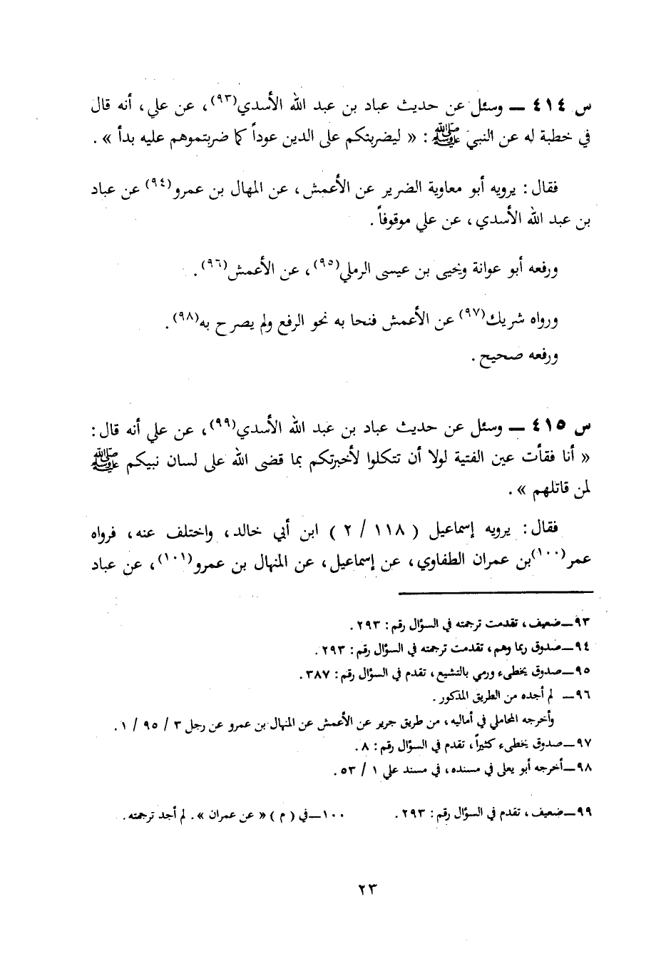 414- وَسُئِلَ عَنْ حَدِيثِ عَبَّادِ بْنِ عَبْدِ اللَّهِ الْأَسَدِيُّ، عَنْ عَلِيٍّ، أَنَّهُ قَالَ فِي خُطْبَةٍ لَهُ، عَنِ النَّبِيِّ صَلَّى اللَّهُ عَلَيْهِ وَسَلَّمَ: لَيَضْرِبَنَّكُمْ عَلَى الدِّينِ عُودًا كَمَا ضَرَبْتُمُوهُمْ عَلَيْهِ بدأ.