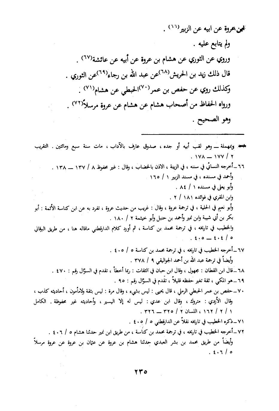 وَرَوَاهُ الْحُفَّاظُ مِنْ أَصْحَابِ هِشَامٍ، عَنْ هِشَامٍ، عَنْ عُرْوَةَ مُرْسَلًا.