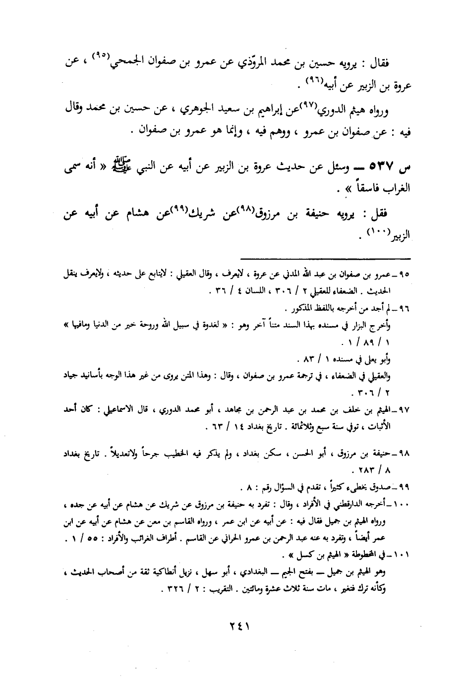 536- وَسُئِلَ عَنْ حَدِيثِ عُرْوَةَ، عَنِ الزُّبَيْرِ، عَنِ النَّبِيِّ صَلَّى اللَّهُ عَلَيْهِ وَسَلَّمَ، قال: من صَلَّى الْغَدَاةَ، وَجَلَسَ فِي مَجْلِسِهِ حَتَّى تَطْلُعَ الشَّمْسُ، كَانَتْ لَغَدْوَةً فِي سَبِيلِ اللَّهِ.