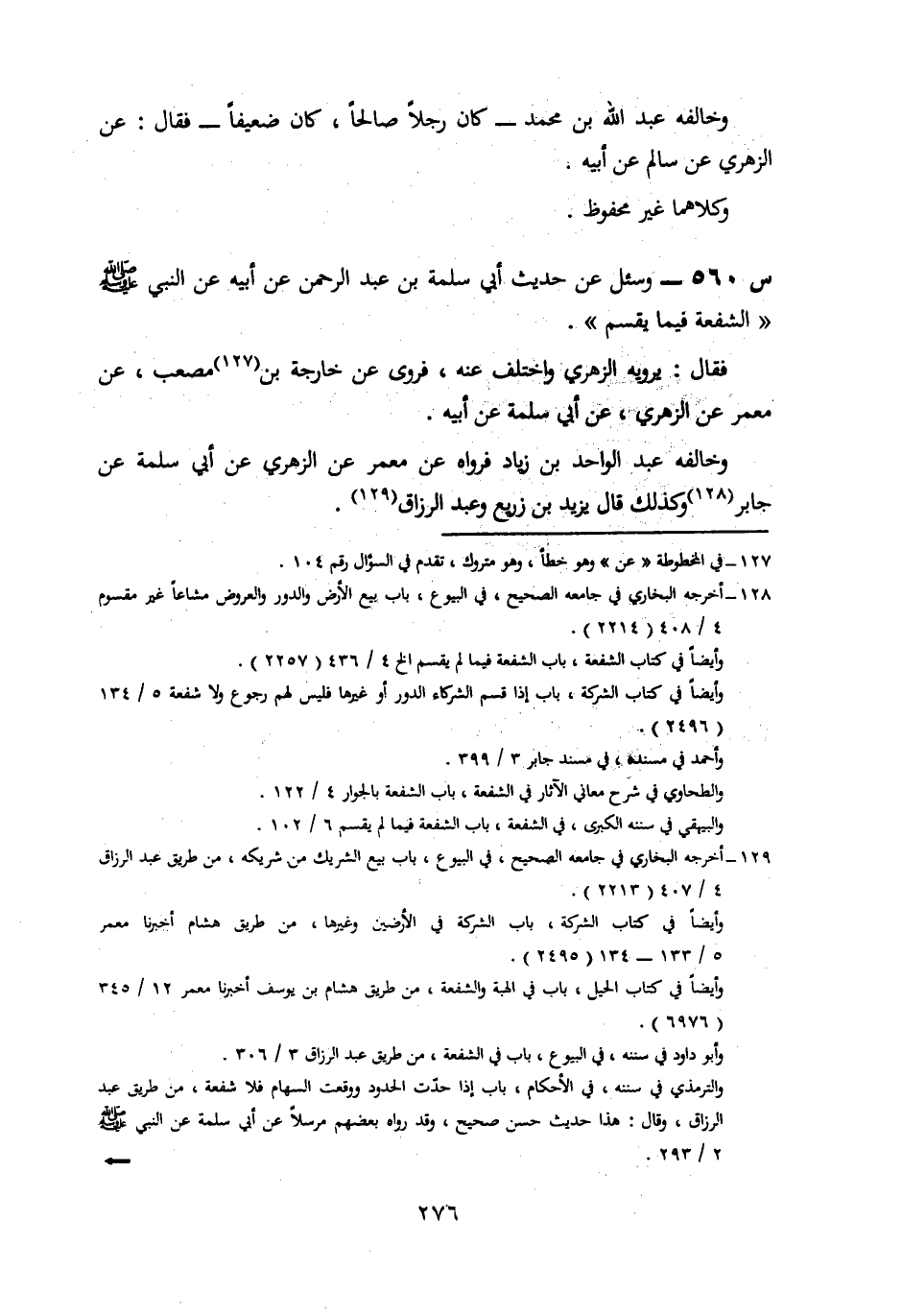 560- وَسُئِلَ عَنْ حَدِيثِ أَبِي سَلَمَةَ بْنِ عَبْدِ الرحمن، عَنْ أَبِيهِ، عَنِ النَّبِيِّ صَلَّى اللَّهُ عَلَيْهِ وَسَلَّمَ: الشُّفْعَةُ فِيمَا يُقْسَمُ.