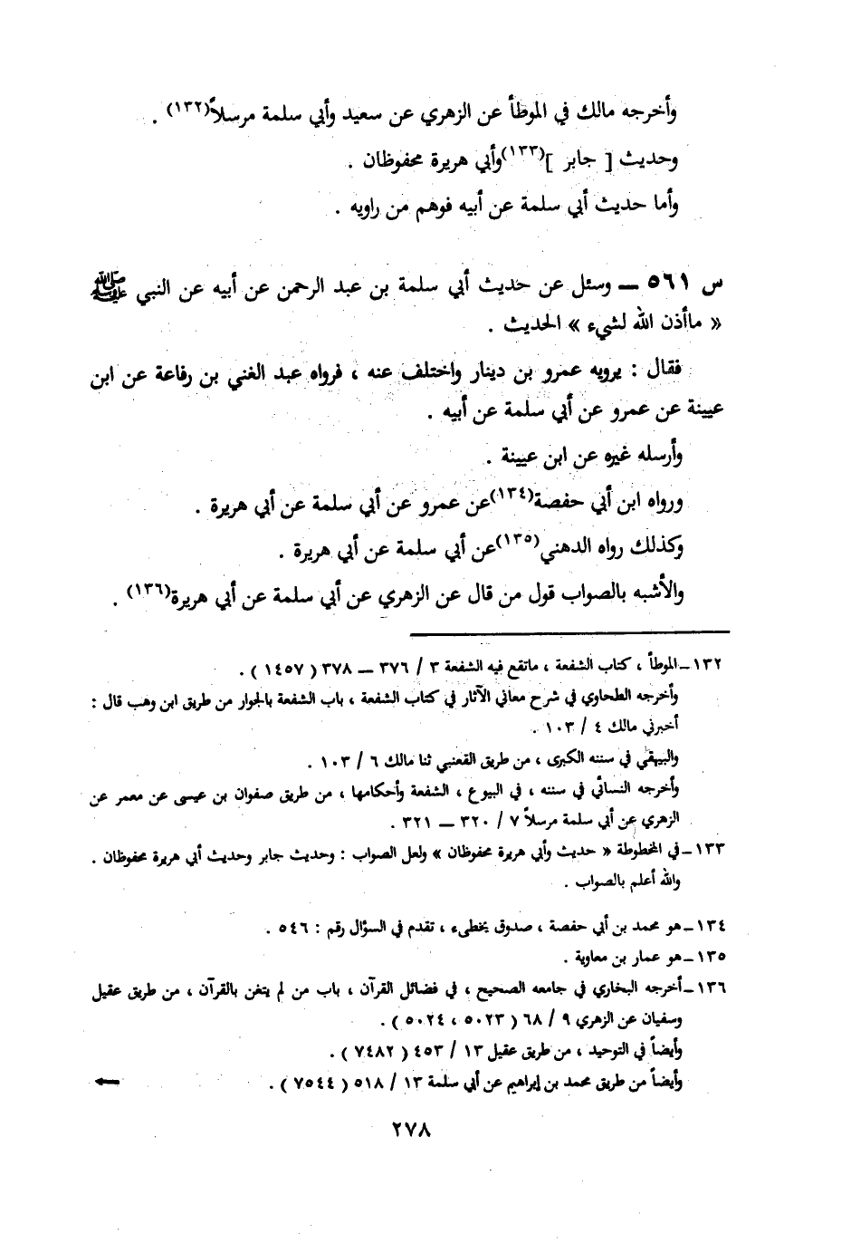 561- وَسُئِلَ عَنْ حَدِيثِ أَبِي سَلَمَةَ بْنِ عَبْدِ الرحمن، عَنْ أَبِيهِ، عَنِ النَّبِيِّ صَلَّى اللَّهُ عَلَيْهِ وَسَلَّمَ: مَا أَذِنَ اللَّهُ لِشَيْءٍ ... الْحَدِيثَ.