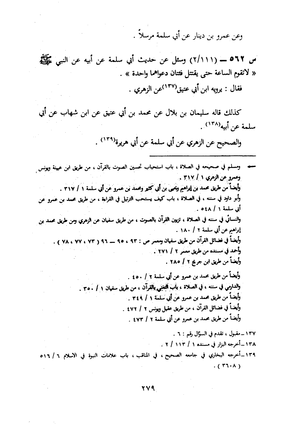 562- وَسُئِلَ عَنْ حَدِيثِ أَبِي سَلَمَةَ، عَنْ أَبِيهِ، عَنِ النَّبِيِّ صَلَّى اللَّهُ عَلَيْهِ وَسَلَّمَ: لَا تَقُومُ السَّاعَةُ حَتَّى يَقْتَتِلَ فِئَتَانِ دَعْوَاهُمَا وَاحِدَةٌ.