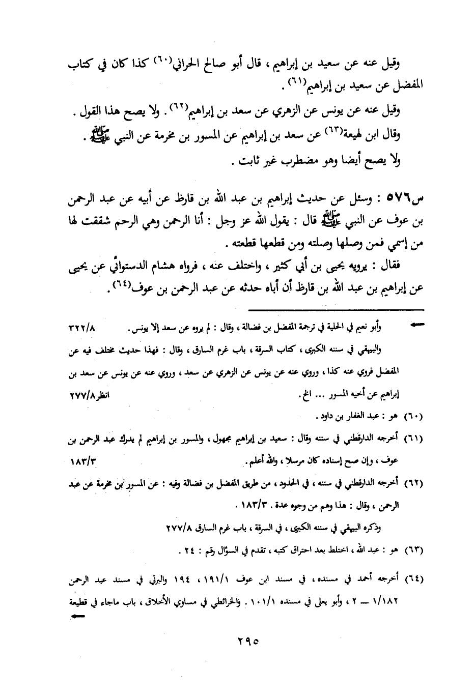 576- وَسُئِلَ عَنْ حَدِيثِ إِبْرَاهِيمَ بْنِ عَبْدِ اللَّهِ بْنِ قَارِظٍ، عَنْ أَبِيهِ، عَنْ عَبْدِ الرَّحْمَنِ بْنِ عَوْفٍ، عَنِ النَّبِيِّ صَلَّى اللَّهُ عَلَيْهِ وَسَلَّمَ، قَالَ: يَقُولُ اللَّهُ عَزَّ وَجَلَّ: أَنَا الرَّحْمَنُ وَهِيَ الرَّحِمُ، شَقَقْتُ لَهَا مِنَ اسْمِي، فَمَنْ وَصَلَهَا وَصَلْتُهُ، وَمَنْ قَطَعَهَا قَطَعْتُهُ.