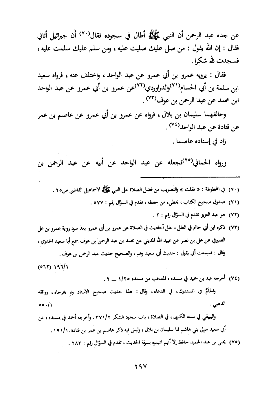 577- وَسُئِلَ عَنْ حَدِيثِ عَبْدِ الْوَاحِدِ بْنِ مُحَمَّدِ بْنِ عَبْدِ الرَّحْمَنِ بْنِ عَوْفٍ، عَنْ جَدِّهِ عَبْدِ الرَّحْمَنِ أَنَّ النَّبِيَّ صَلَّى اللَّهُ عَلَيْهِ وَسَلَّمَ أَطَالَ فِي سُجُودِهِ، فَقَالَ: إِنَّ جِبْرَائِيلَ أَتَانِي، فَقَالَ: إِنَّ اللَّهَ، يَقُولُ: مَنْ صَلَّى عَلَيْكَ صَلَّيْتُ عَلَيْهِ، وَمَنْ سَلَّمَ عَلَيْكَ سَلَّمْتُ عَلَيْهِ، فَسَجَدْتُ للَّهِ شُكْرًا.