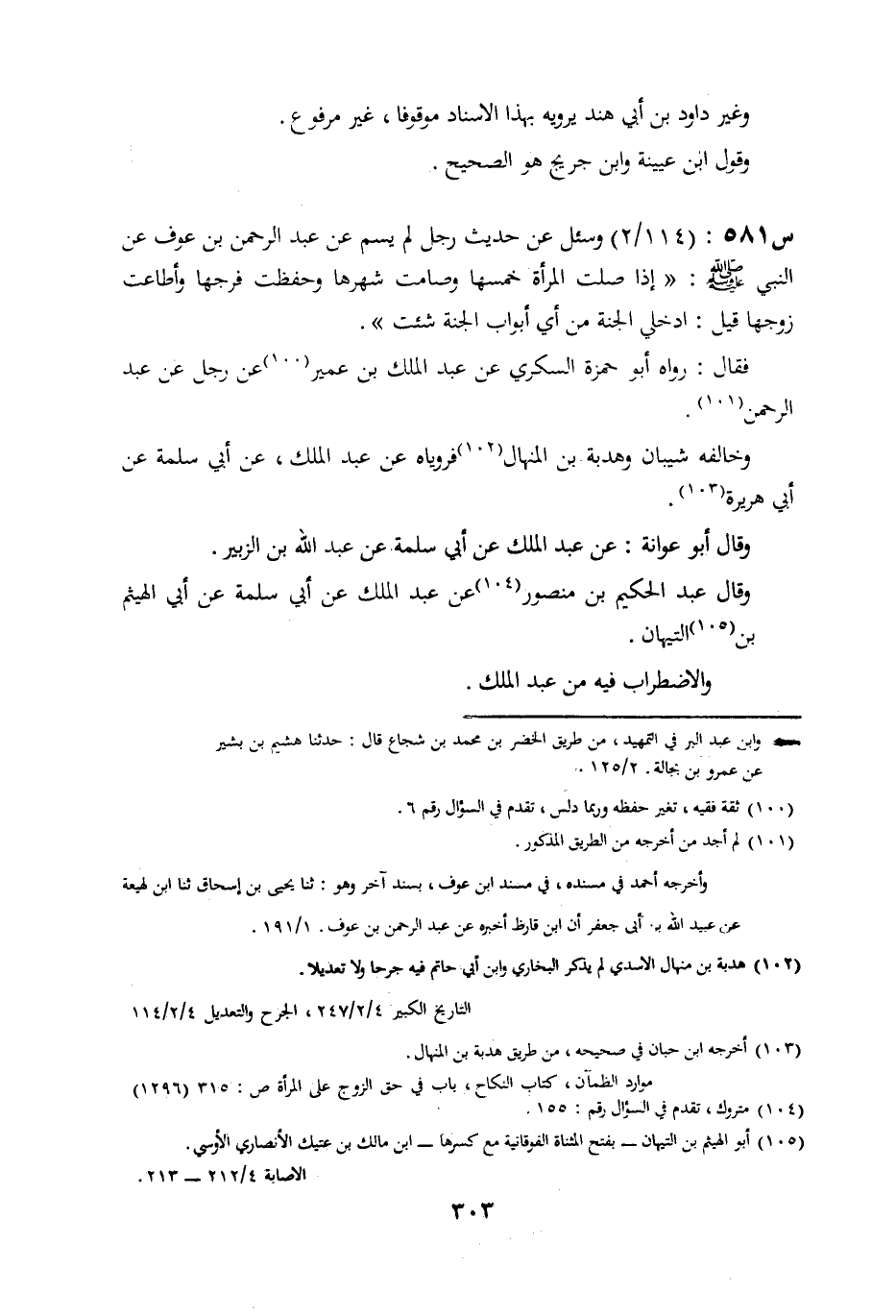 581- وسئل عن حديث رجل لم يسم، عن عَبْدِ الرَّحْمَنِ بْنِ عَوْفٍ، عَنِ النَّبِيِّ صَلَّى اللَّهُ عَلَيْهِ وَسَلَّمَ: إِذَا صَلَّتِ الْمَرْأَةُ خَمْسَهَا، وَصَامَتْ شَهْرَهَا، وَحَفِظَتْ فَرْجَهَا، وَأَطَاعَتْ زَوْجَهَا، قِيلَ: ادْخُلِي الْجَنَّةَ مِنْ أَيِّ أَبْوَابِ الْجَنَّةِ شِئْتِ.