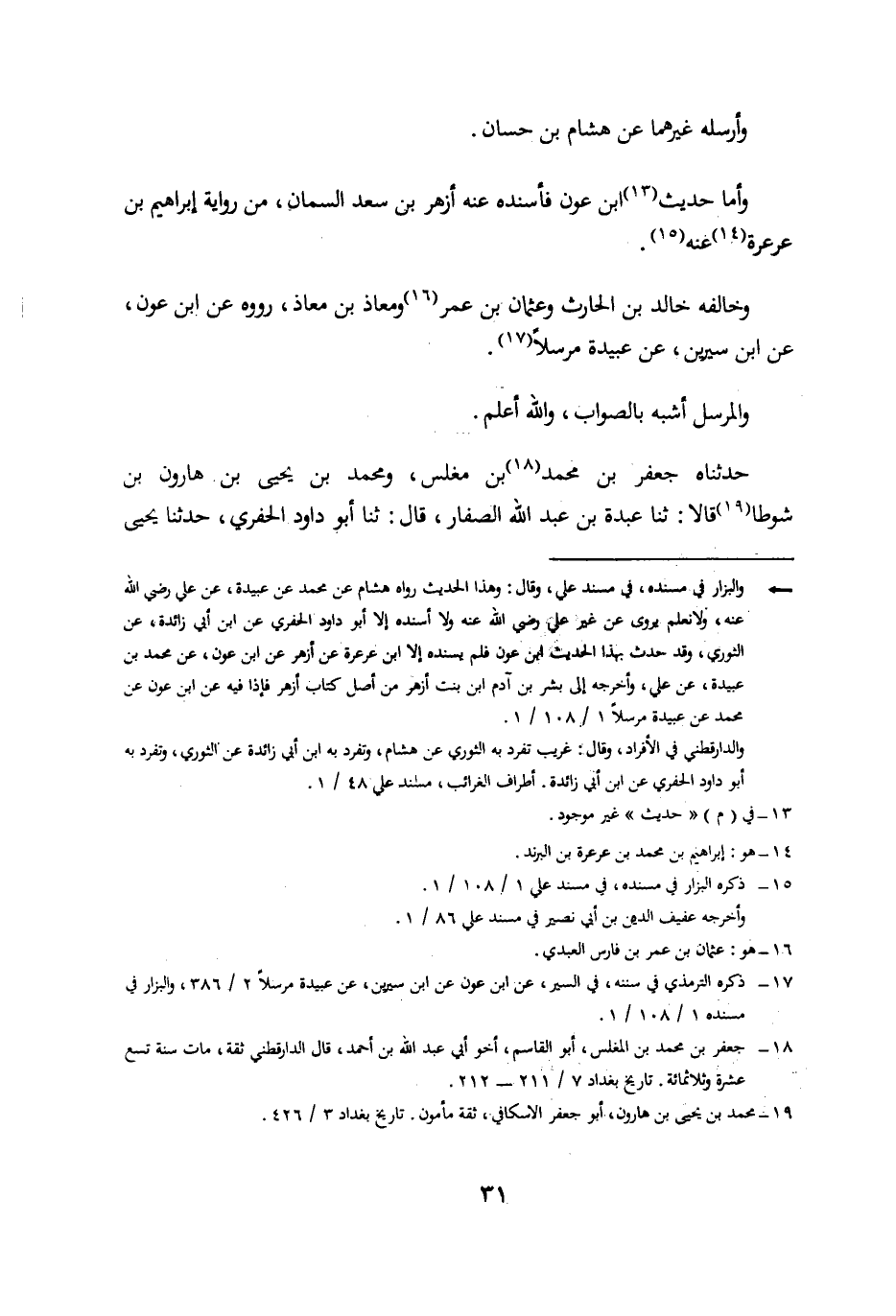 وَخَالَفَهُ خَالِدُ بْنُ الْحَارِثِ، وَعُثْمَانُ بْنُ عُمَرَ، وَمُعَاذُ بْنُ مُعَاذٍ، رَوُوهُ عَنِ ابْنِ عَوْنٍ، عَنِ ابْنِ سِيرِينَ، عَنْ عُبَيْدَةَ مُرْسَلًا.
