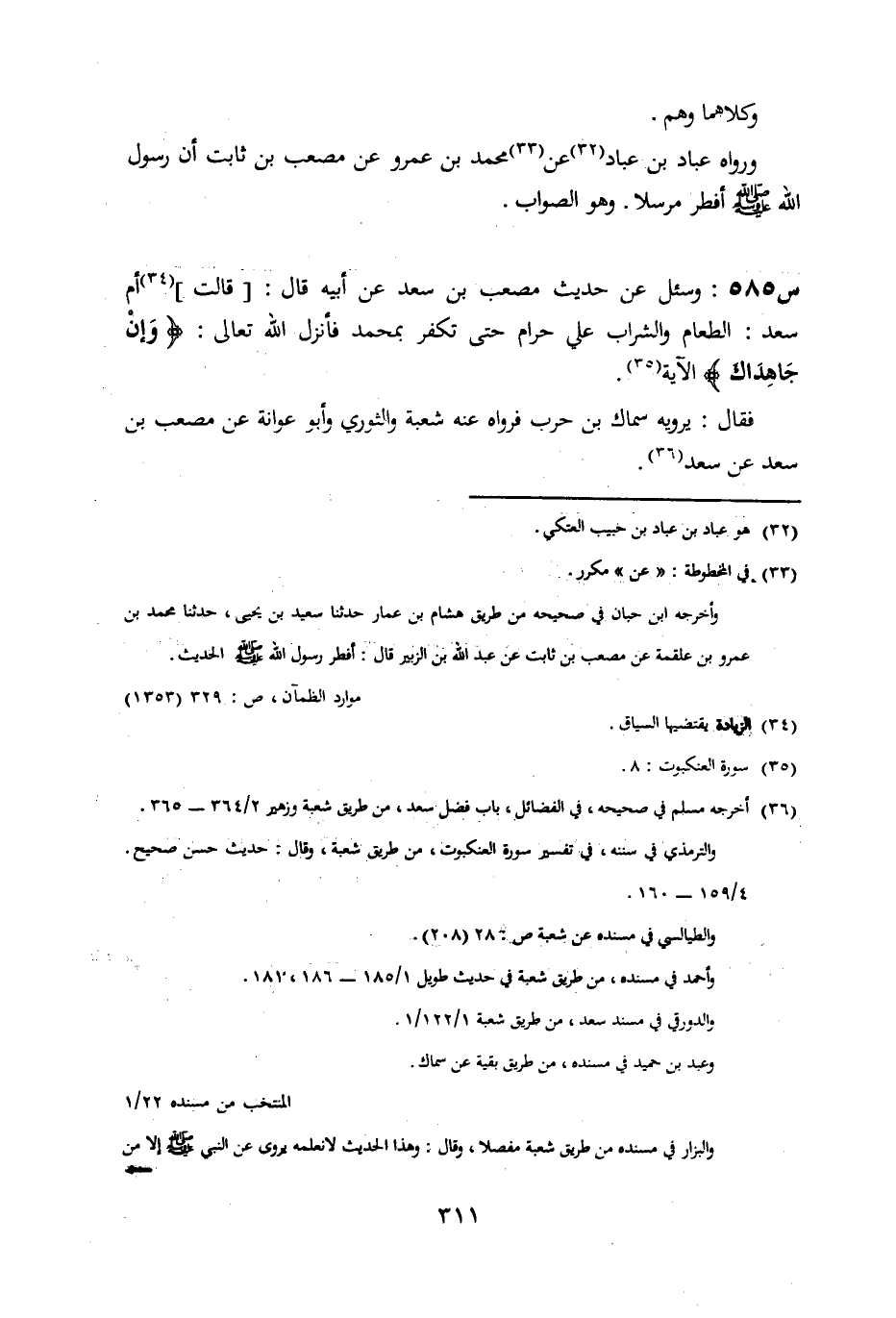 585- وسئل عن حديث مصعب بن سعد، عن أَبِيهِ قَالَ قَالَتْ أُمُّ سَعْدٍ الطَّعَامُ وَالشَّرَابُ عَلَيَّ حَرَامٌ حَتَّى تَكْفُرَ بِمُحَمَّدٍ فَأَنْزَلَ اللَّهُ تعالى: {وإن جاهداك} الْآيَةَ.