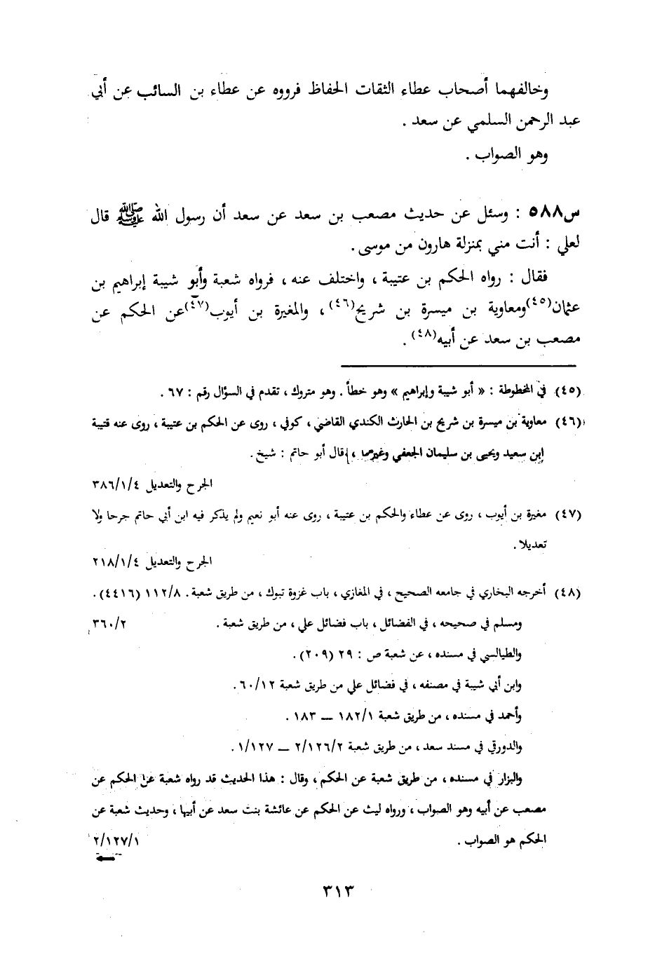 588- وَسُئِلَ عَنْ حَدِيثِ مُصْعَبِ بْنِ سَعْدٍ، عَنْ سَعْدٍ أَنَّ رَسُولَ اللَّهِ صَلَّى اللَّهُ عَلَيْهِ وَسَلَّمَ، قَالَ لِعَلِيٍّ: أَنْتَ مِنِّي بِمَنْزِلَةِ هَارُونَ مِنْ مُوسَى.