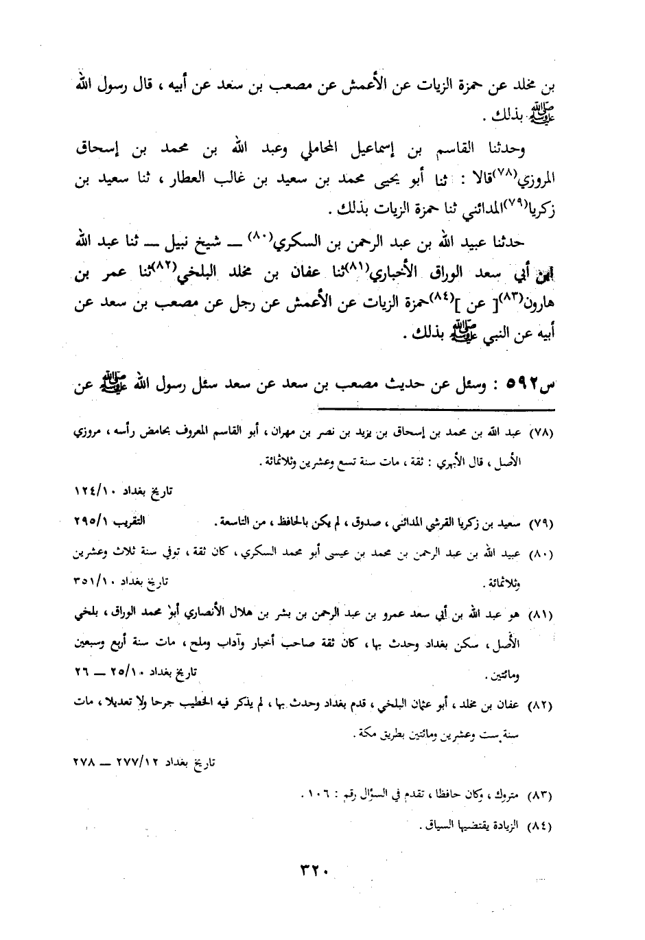 حَدَّثَنَا عُبَيْدُ اللَّهِ بْنُ عبد الرحمن بن السكري شيخ نبيل، حدثنا عَبْدُ اللَّهِ بْنُ أَبِي سَعْدٍ الْوَرَّاقُ الْأَخْبَارِيُّ، حدثنا عفان بن مخلد البلخي، حدثنا عُمَرُ بْنُ هَارُونَ، عَنْ حَمْزَةَ الزَّيَّاتِ، عَنِ الْأَعْمَشِ، عَنْ رَجُلٍ، عَنْ مُصْعَبِ بْنِ سَعْدٍ، عَنْ أَبِيهِ، عَنِ النَّبِيِّ صَلَّى اللَّهُ عَلَيْهِ وسلم بذلك.