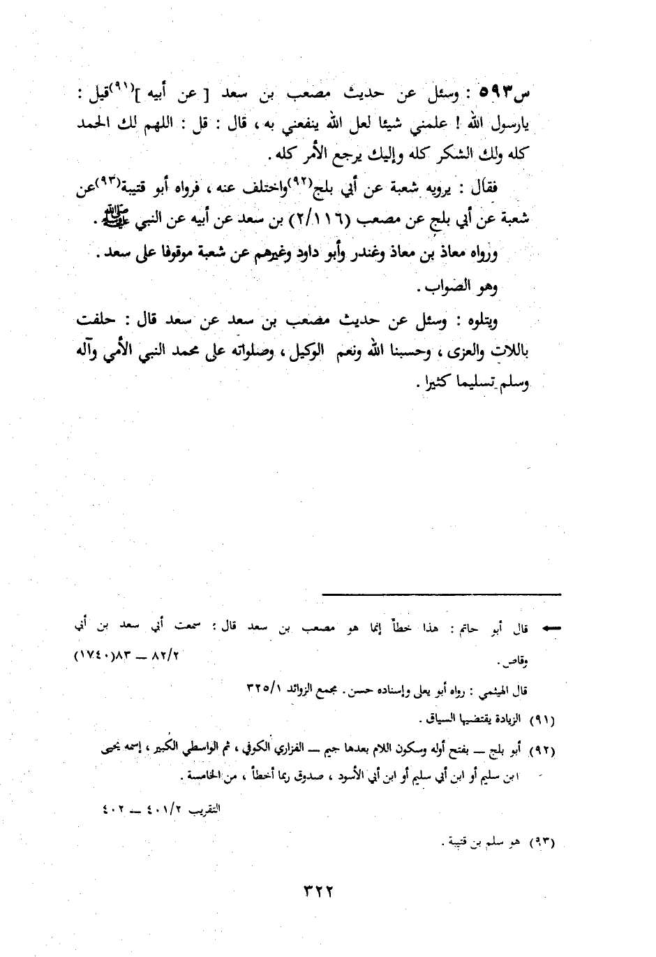 593- وَسُئِلَ عَنْ حَدِيثِ مُصْعَبِ بْنِ سَعْدٍ، عَنْ أَبِيهِ، قِيلَ يَا رَسُولَ اللَّهِ، عَلِّمْنِي شَيْئًا لَعَلَّ اللَّهَ يَنْفَعَنِي بِهِ، قَالَ: قُلِ: اللَّهُمَّ لَكَ الْحَمْدُ كُلُّهُ، وَلَكَ الشُّكْرُ كُلُّهُ، وَإِلَيْكَ يَرْجِعُ الْأَمْرُ كُلُّهُ.