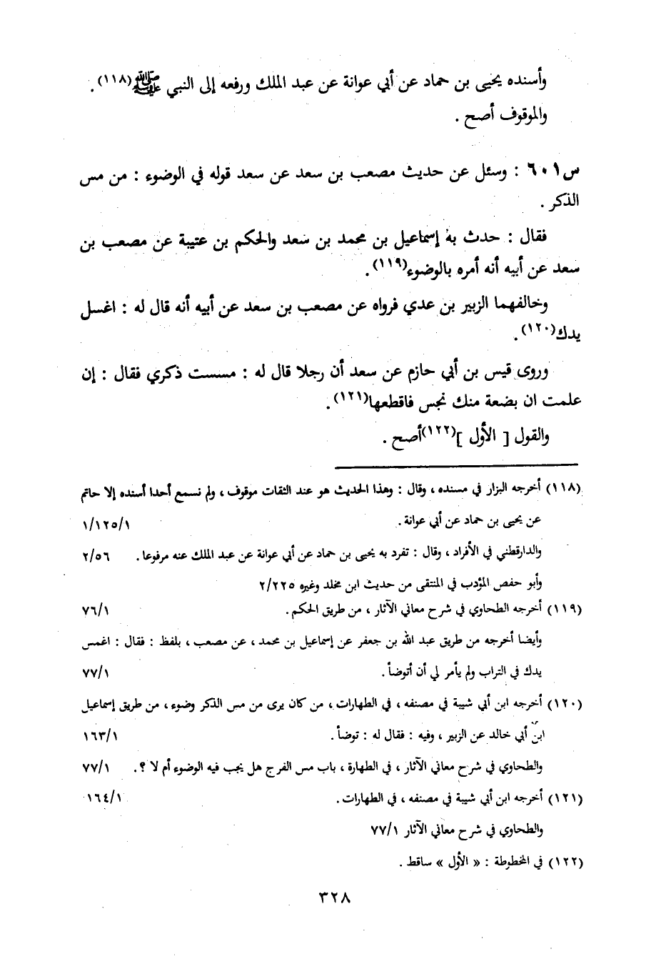 601- وَسُئِلَ عَنْ حَدِيثِ مُصْعَبِ بْنِ سَعْدٍ، عَنْ سَعْدٍ، قَوْلُهُ فِي الْوُضُوءِ: مَنْ مَسَّ الذَّكَرَ.