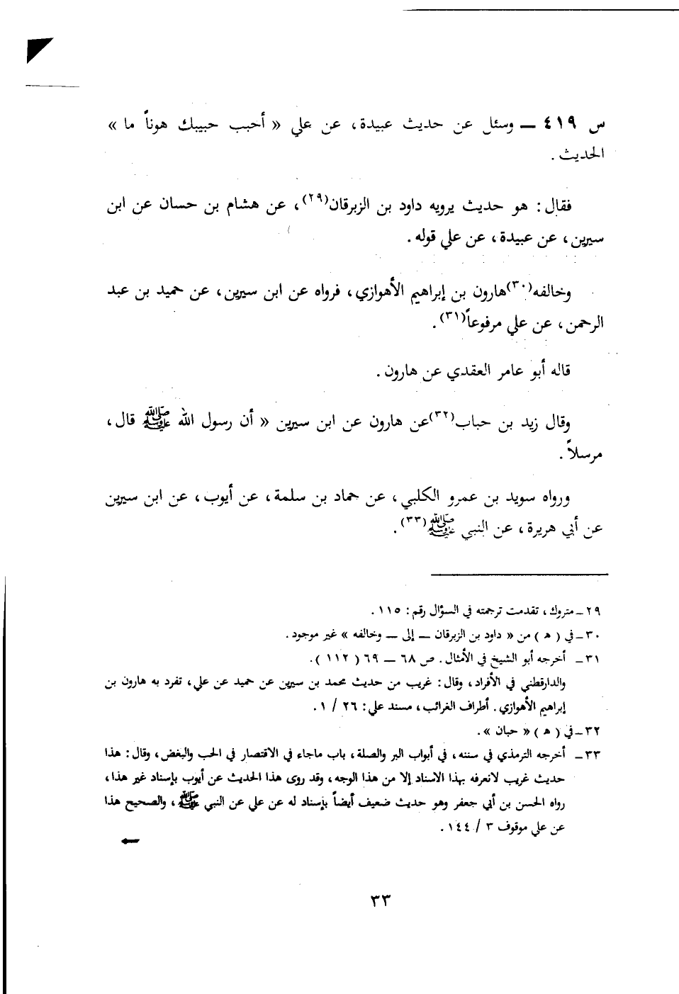 419- وَسُئِلَ عَنْ حَدِيثِ عُبَيْدَةَ، عَنْ عَلِيٍّ أَحْبِبْ حَبِيبَكَ هَوْنًا مَا الْحَدِيثَ.