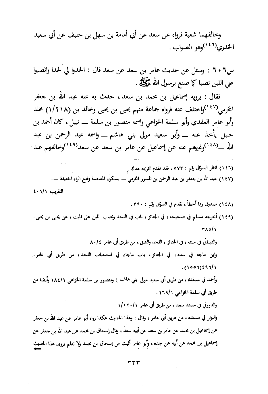 606- وَسُئِلَ عَنْ حَدِيثِ عَامِرِ بْنِ سَعْدٍ، عَنْ سَعْدٍ، قَالَ الْحَدُوا لِي لَحْدًا، وَانْصِبُوا عَلَيَّ اللَّبِنَ نَصْبًا، كَمَا صُنِعَ بِرَسُولِ اللَّهِ صَلَّى اللَّهُ عَلَيْهِ وَسَلَّمَ.