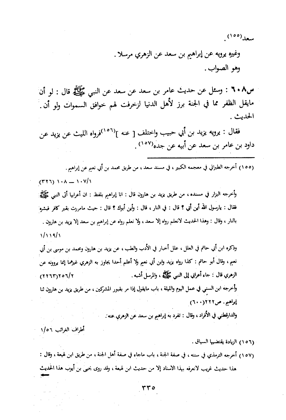 608- وَسُئِلَ عَنْ حَدِيثِ عَامِرِ بْنِ سَعْدٍ، عَنْ سَعْدٍ، عَنِ النَّبِيِّ صَلَّى اللَّهُ عَلَيْهِ وَسَلَّمَ، قَالَ: لَوْ أَنَّ مَا يُقِلُّ الظُّفْرُ مِمَّا فِي الْجَنَّةِ بَرَزَ لِأَهْلِ الدُّنْيَا لَزُخْرِفَتْ لَهُمْ خوافق السماوات، وَلَوْ أَنَّ ... الْحَدِيثَ.