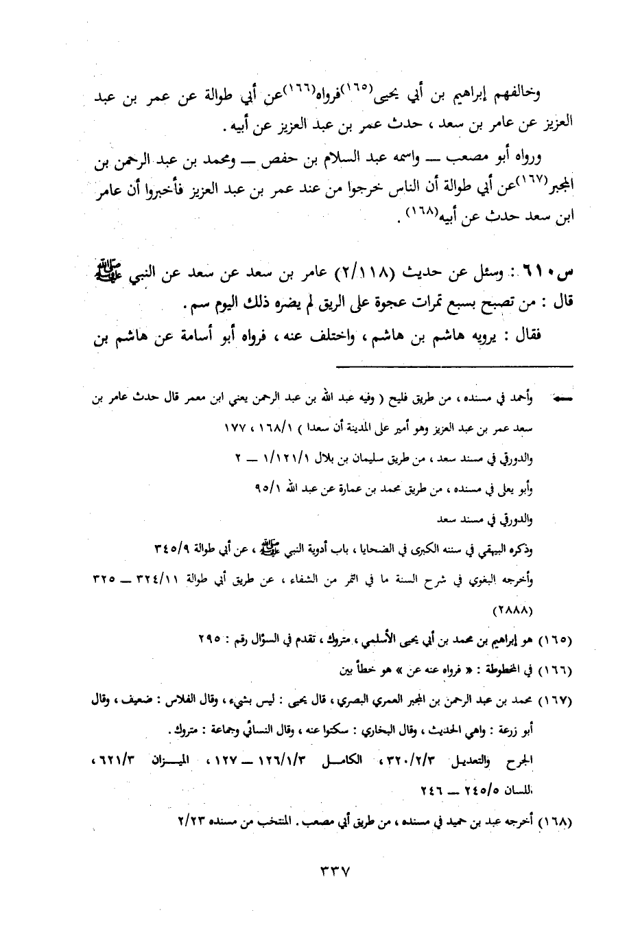 610- وَسُئِلَ عَنْ حَدِيثِ عَامِرِ بْنِ سَعْدٍ، عَنْ سَعْدٍ، عَنِ النَّبِيِّ صَلَّى اللَّهُ عَلَيْهِ وَسَلَّمَ، قَالَ: مَنْ تَصَبَّحَ بِسِبْعِ تَمَرَاتٍ عَجْوَةٍ عَلَى الرِّيقِ لَمْ يَضُرَّهُ ذَلِكَ الْيَوْمَ سُمٌّ.