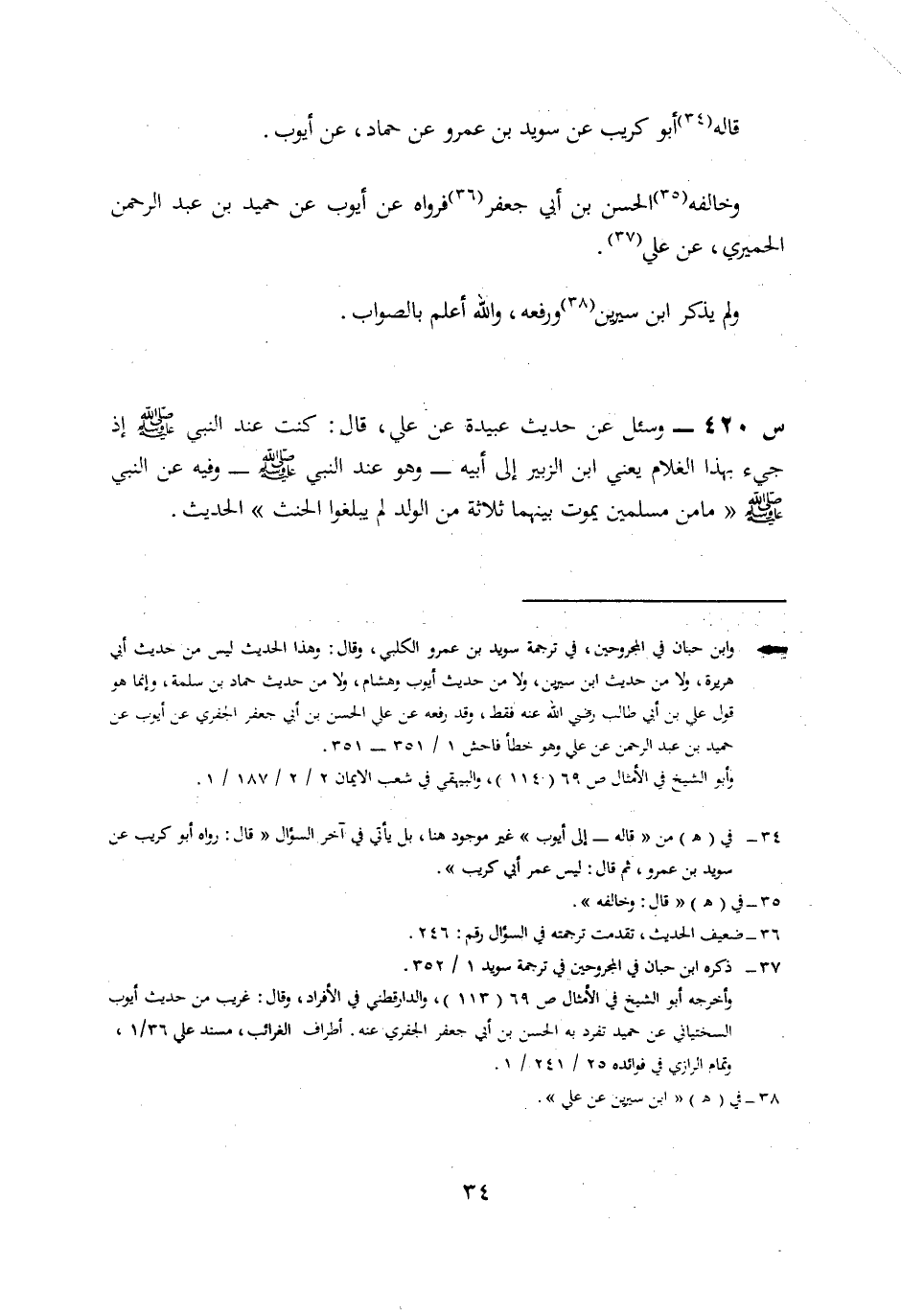 420- وَسُئِلَ عَنْ حَدِيثِ عُبَيْدَةَ، عَنْ عَلِيٍّ، قَالَ كُنْتُ عِنْدَ النَّبِيِّ صَلَّى اللَّهُ عَلَيْهِ وَسَلَّمَ إِذْ جِيءَ بِهَذَا الْغُلَامِ، يَعْنِي: ابْنَ الزُّبَيْرِ إِلَى أَبِيهِ، وَهُوَ عِنْدَ النَّبِيِّ صَلَّى اللَّهُ عَلَيْهِ وَسَلَّمَ، وَفِيهِ عَنِ النَّبِيِّ صَلَّى اللَّهُ عَلَيْهِ وَسَلَّمَ: مَا مِنْ مُسْلِمَيْنِ يَمُوتُ بَيْنَهُمَا ثَلَاثَةٌ مِنَ الْوَلَدِ لَمْ يَبْلُغُوا الحِنْثَ الْحَدِيثَ.