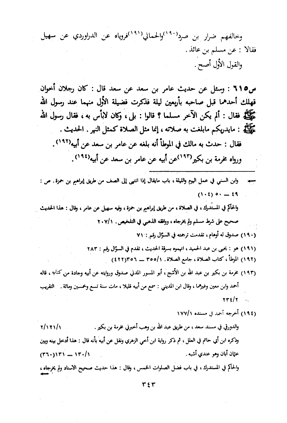 615- وَسُئِلَ عَنْ حَدِيثِ عَامِرِ بْنِ سَعْدٍ، عَنْ سَعْدٍ، قَالَ كَانَ رَجُلَانِ أَخَوَانِ فَهَلَكَ أَحَدُهُمَا قَبْلَ صَاحِبِهِ بِأَرْبَعِينَ لَيْلَةً، فَذُكِرَتْ فَضِيلَةُ الْأَوَّلُ مِنْهُمَا عِنْدَ رَسُولِ اللَّهِ صَلَّى اللَّهُ عَلَيْهِ وَسَلَّمَ، فَقَالَ: أَلَمْ يَكُنِ الْآخَرُ مُسْلِمًا؟ قَالُوا: بَلَى، وَكَانَ لَا بَأْسَ بِهِ، فَقَالَ رَسُولُ اللَّهِ صَلَّى اللَّهُ عَلَيْهِ وَسَلَّمَ: مَا يُدْرِيكُمْ مَا بَلَغَتْ بِهِ صَلَاتُهُ، إِنَّمَا مَثَلُ الصَّلَاةِ كَمَثَلِ النَّهْرِ.... الْحَدِيثَ.