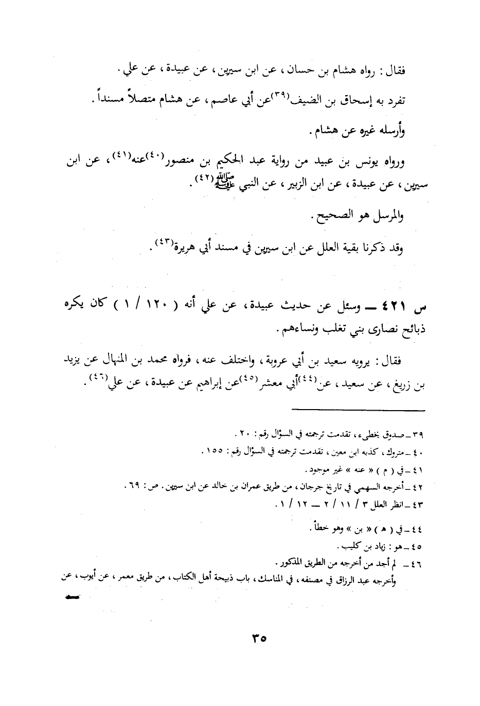 421- وَسُئِلَ عَنْ حَدِيثِ عُبَيْدَةَ، عَنْ عَلِيٍّ أَنَّهُ كَانَ يَكْرَهُ ذَبَائِحَ نَصَارَى بَنِي تَغْلِبَ وَنِسَاءَهُمْ.