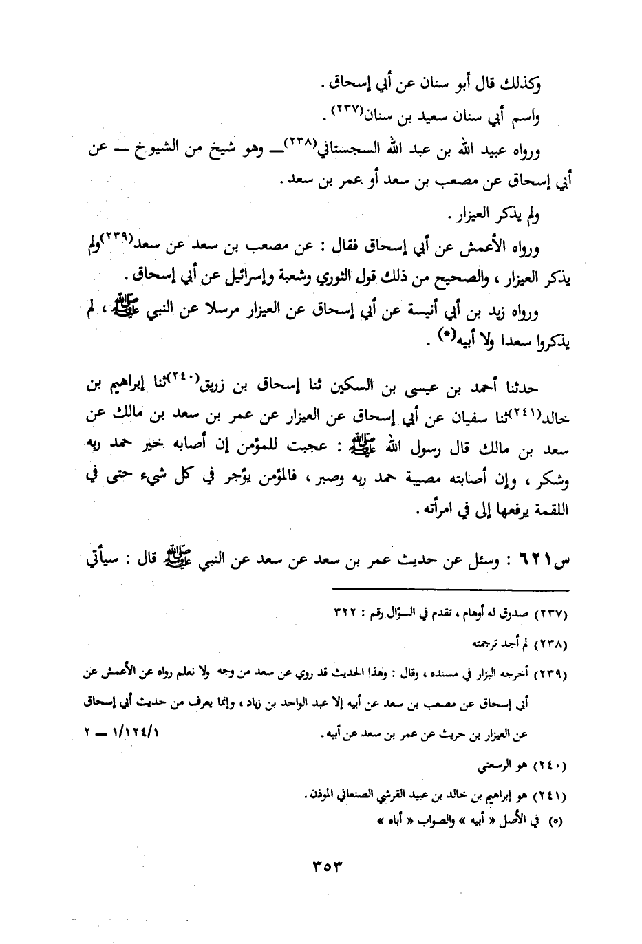 وَرَوَاهُ الْأَعْمَشُ، عَنْ أَبِي إِسْحَاقَ، فَقَالَ: عَنْ مُصْعَبِ بْنِ سَعْدٍ، عَنْ سَعْدٍ، وَلَمْ يَذْكُرِ الْعِيزَارَ، وَالصَّحِيحُ مِنْ ذَلِكَ قَوْلُ الثَّوْرِيِّ، وَشُعْبَةُ، وَإِسْرَائِيلُ، عَنْ أَبِي إِسْحَاقَ.