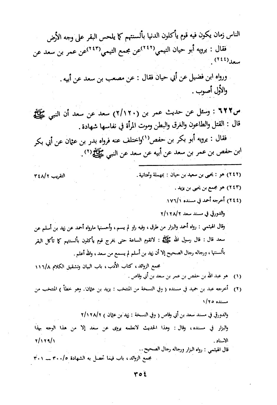 621- وَسُئِلَ عَنْ حَدِيثِ عُمَرَ بْنِ سَعْدٍ، عَنْ سَعْدٍ، عَنِ النَّبِيِّ صَلَّى اللَّهُ عَلَيْهِ وَسَلَّمَ، قال: سيأتي الناس زمان يكون فيه قَوْمٌ يَأْكُلُونَ الدُّنْيَا بِأَلْسِنَتِهِمْ، كَمَا يَلْحَسُ الْبَقَرُ عَلَى وَجْهِ الْأَرْضِ.