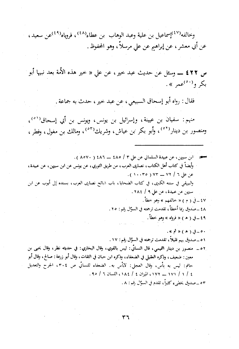 422- وَسُئِلَ عَنْ حَدِيثِ عَبْدِ خَيْرٍ، عَنْ عَلِيٍّ خير هذه الأمة بعد نبيها أبو بكر وَعُمَرُ.
