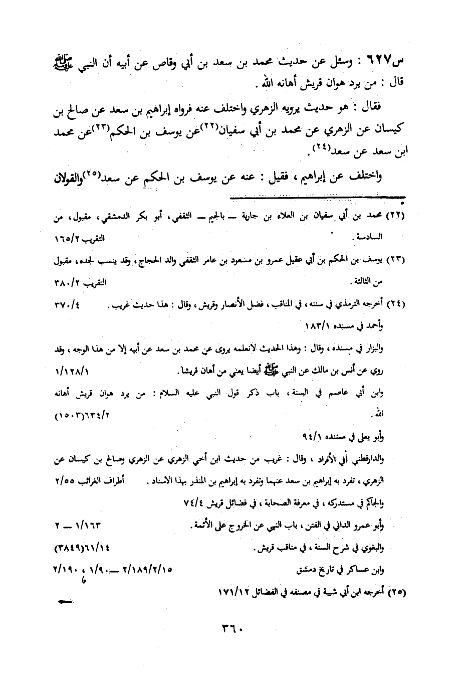 627- وَسُئِلَ عَنْ حَدِيثِ مُحَمَّدِ بْنِ سَعْدِ بْنِ أَبِي وَقَّاصٍ، عَنْ أَبِيهِ، عَنِ النَّبِيِّ صَلَّى اللَّهُ عَلَيْهِ وَسَلَّمَ، قَالَ: مَنْ يُرِدْ هَوَانَ قُرَيْشٍ أَهَانَهُ اللَّهُ.