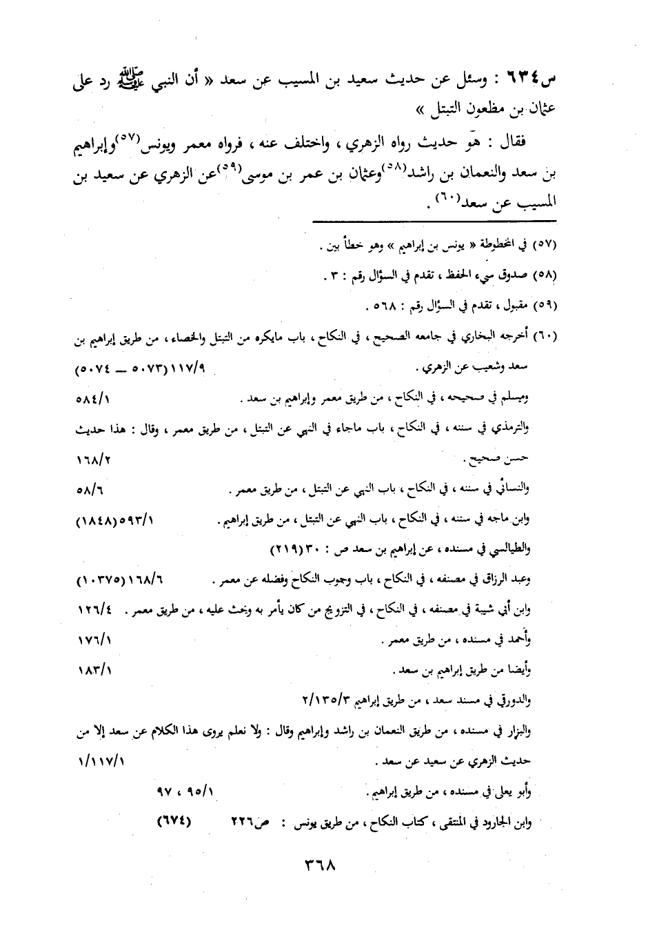 634- وَسُئِلَ عَنْ حَدِيثِ سَعِيدِ بْنِ الْمُسَيِّبِ، عن سعد أن النبي صلى الله عليه وَسَلَّمَ رَدَّ عَلَى عُثْمَانَ بْنِ مَظْعُونٍ التَّبَتُّلَ.