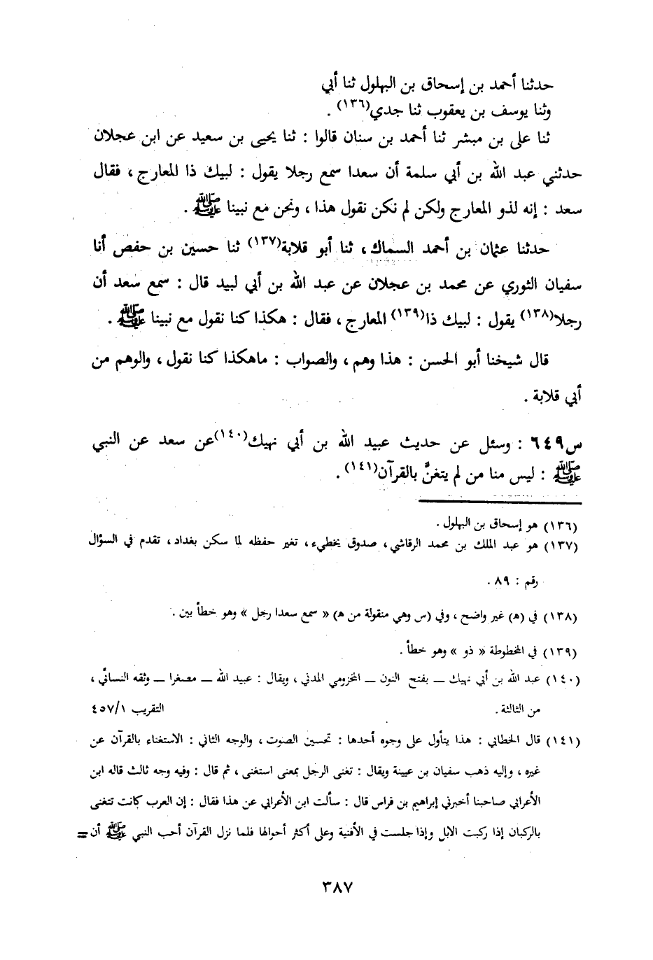 حدثنا علي بن مبشر حدثنا أحمد بن سنان قالوا حَدَّثَنَا يَحْيَى بْنُ سَعِيدٍ، عَنِ ابْنِ عَجْلَانَ حَدَّثَنِي عَبْدُ اللَّهِ بْنُ أَبِي سَلَمَةَ أَنَّ سَعْدًا سَمِعَ رَجُلًا يَقُولُ لَبَّيْكَ ذَا الْمَعَارِجِ فَقَالَ سَعْدٌ إِنَّهُ لَذُو الْمَعَارِجِ وَلَكِنْ لَمْ نَكُنْ نَقُولُ هَذَا وَنَحْنُ مَعَ نَبِيِّنَا صَلَّى اللَّهُ عَلَيْهِ وَسَلَّمَ.