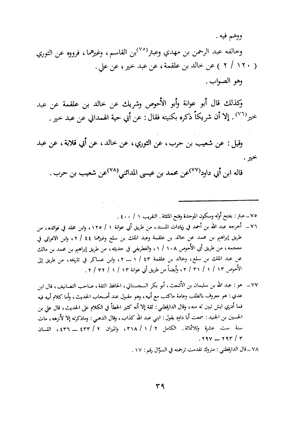 وَخَالَفَهُ عَبْدُ الرَّحَمْنِ بْنُ مَهْدِيٍّ وَعَبْثَرُ بْنُ الْقَاسِمِ وَغَيْرُهُمَا فَرَوُوهُ عَنِ الثَّوْرِيِّ، عَنْ خَالِدِ بْنِ عَلْقَمَةَ، عَنْ عَبْدِ خَيْرٍ عَنْ عَلِيٍّ.