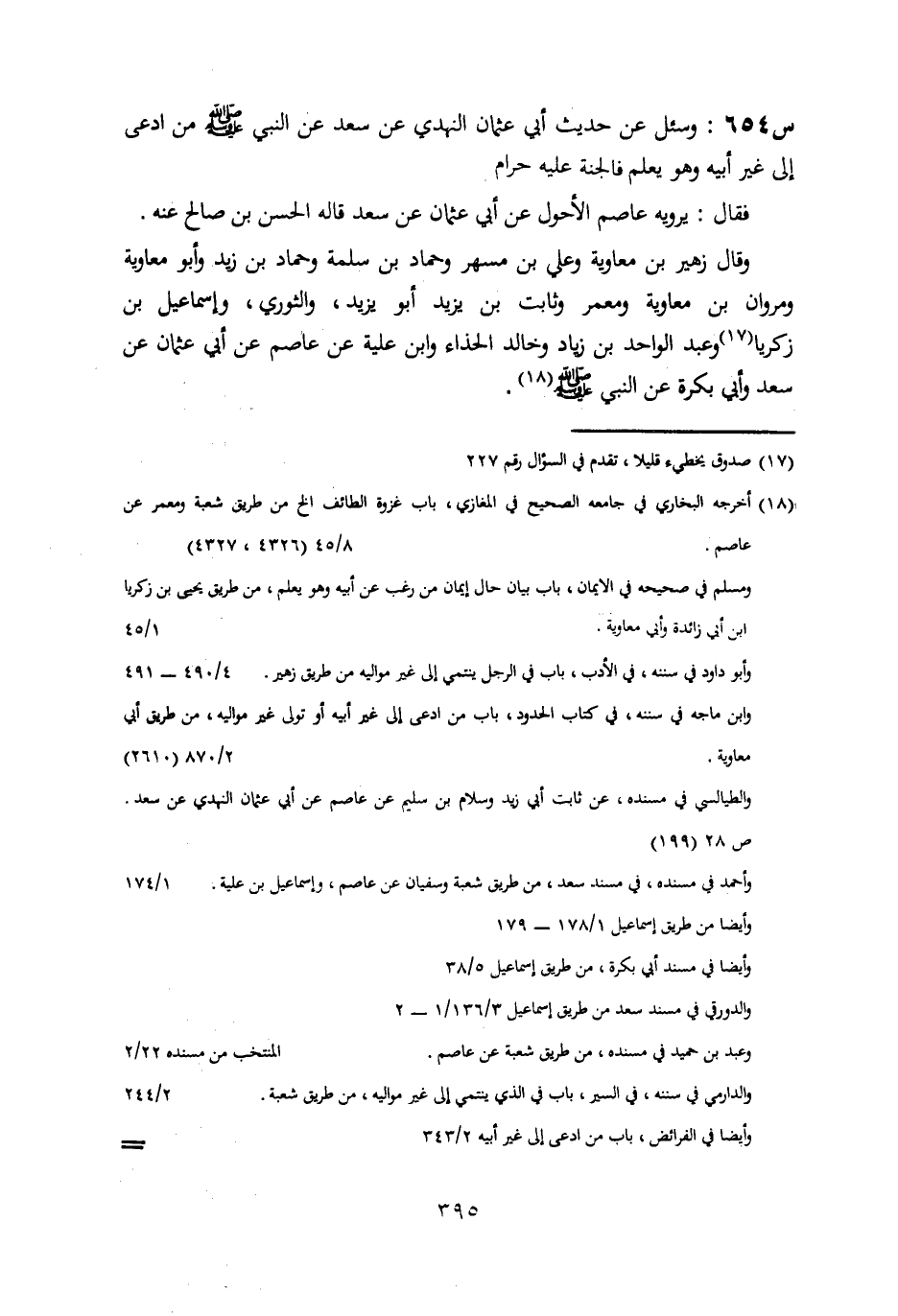 654- وَسُئِلَ عَنْ حَدِيثِ أَبِي عُثْمَانَ النَّهْدِيِّ، عَنْ سَعْدٍ، عَنِ النَّبِيِّ صَلَّى اللَّهُ عَلَيْهِ وَسَلَّمَ: مَنِ ادَّعَى إِلَى غَيْرِ أَبِيهِ وَهُوَ يَعْلَمُ فَالْجَنَّةُ عَلَيْهِ حَرَامٌ.