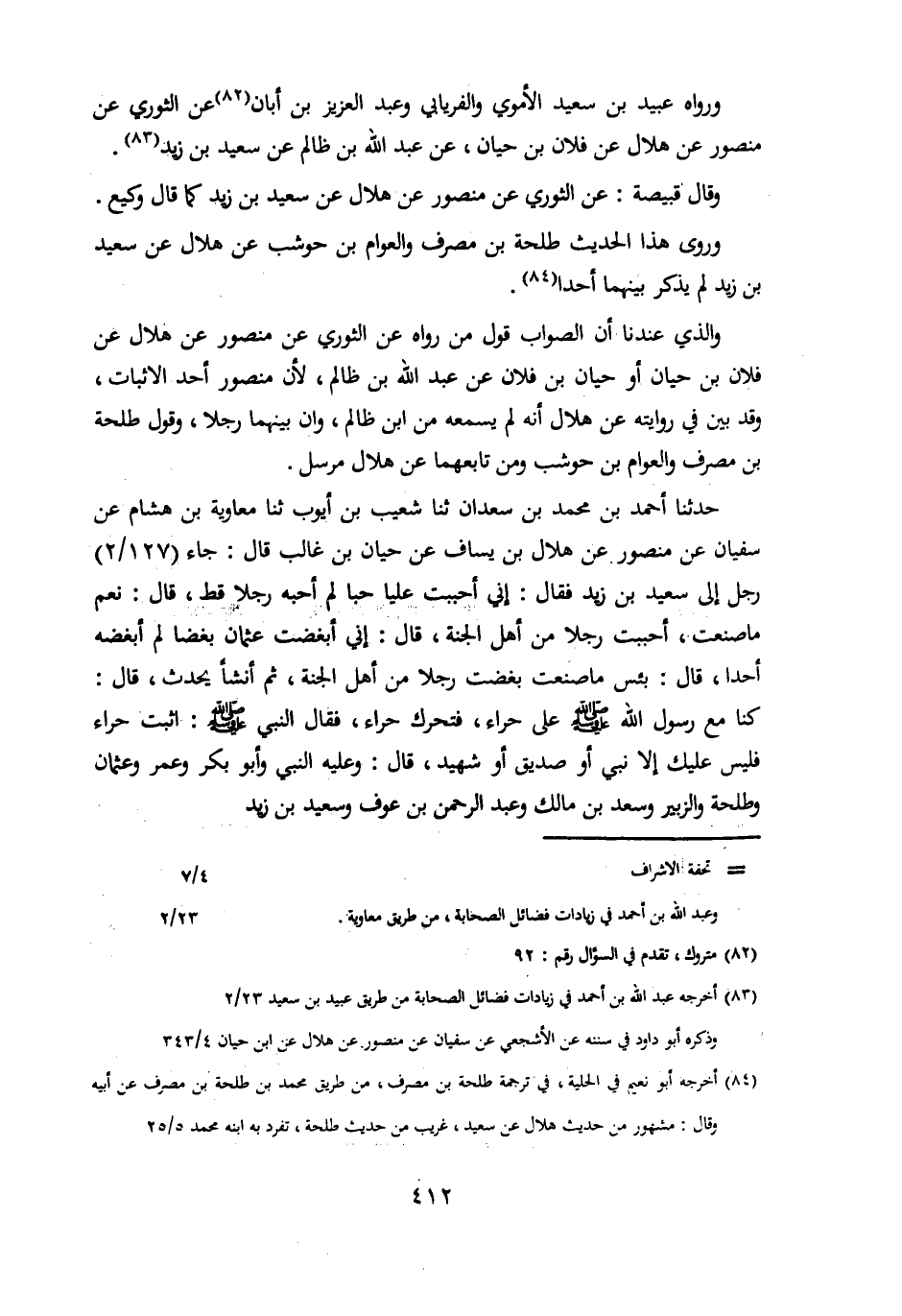 حَدَّثَنَا أَحْمَدُ بْنُ مُحَمَّدِ بْنِ سَعْدَانَ، حدثنا شعيب بن أيوب، حدثنا مُعَاوِيَةُ بْنُ هِشَامٍ، عَنْ سُفْيَانَ، عَنْ مَنْصُورٍ، عَنْ هِلَالِ بْنِ يَسَافٍ، عَنْ حَيَّانَ بْنِ غَالِبٍ، قَالَ: جَاءَ رَجُلٌ إِلَى سَعِيدِ بْنِ زَيْدٍ، فَقَالَ إِنِّي أَحْبَبْتُ عَلِيًّا حُبًّا لَمْ أُحِبَّهُ رَجُلًا قَطُّ، قَالَ: نِعْمَ مَا صَنَعْتَ، أَحْبَبْتَ رَجُلًا مِنْ أَهْلِ الْجَنَّةِ، قَالَ: إِنِّي أَبْغَضْتُ عُثْمَانَ بُغْضًا لَمْ أَبْغَضْهُ أَحَدًا، قَالَ: بِئْسَ مَا صَنَعْتَ، بَغَضْتَ رَجُلًا مِنْ أَهْلِ الْجَنَّةِ، ثُمَّ أَنْشَأَ يُحَدِّثُ، قَالَ: كُنَّا مَعَ رَسُولِ اللَّهِ صَلَّى اللَّهُ عليه وسلم على حِرَاءٍ، فَتَحَرَّكَ حِرَاءٌ، فَقَالَ النَّبِيُّ صَلَّى اللَّهُ عَلَيْهِ وَسَلَّمَ: اثْبُتْ حِرَاءُ فَلَيْسَ عَلَيْكَ إِلَّا نَبِيٌّ أَوْ صِدِّيقٌ أَوْ شَهِيدٌ، قَالَ: وَعَلَيْهِ النَّبِيُّ، وَأَبُو بَكْرٍ، وَعُمَرُ، وَعُثْمَانُ، وَطَلْحَةُ، وَالزُّبَيْرُ، وَسَعْدُ بْنُ مَالِكٍ، وَعَبْدُ الرَّحْمَنِ بْنُ عَوْفٍ، وسعيد بن زيد.