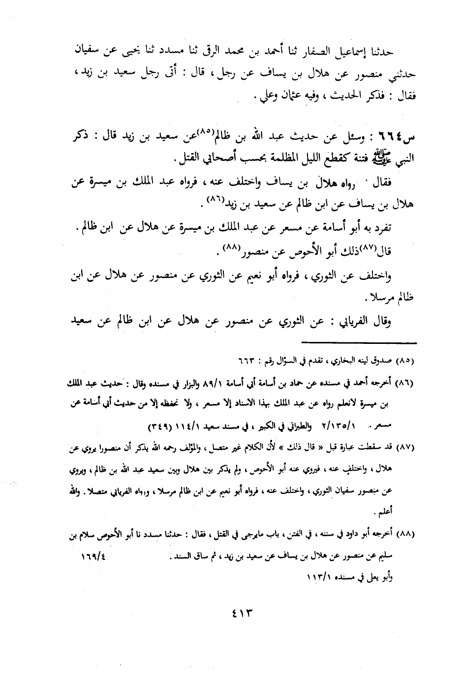 664- وَسُئِلَ عَنْ حَدِيثِ عَبْدِ اللَّهِ بْنِ ظَالِمٍ، عَنْ سَعِيدِ بْنِ زَيْدٍ، قَالَ ذَكَرَ النَّبِيُّ صَلَّى اللَّهُ عَلَيْهِ وَسَلَّمَ فِتْنَةً كَقِطَعِ اللَّيْلِ الْمُظْلِمَةِ بِحَسْبِ أَصْحَابِي الْقَتْلُ.