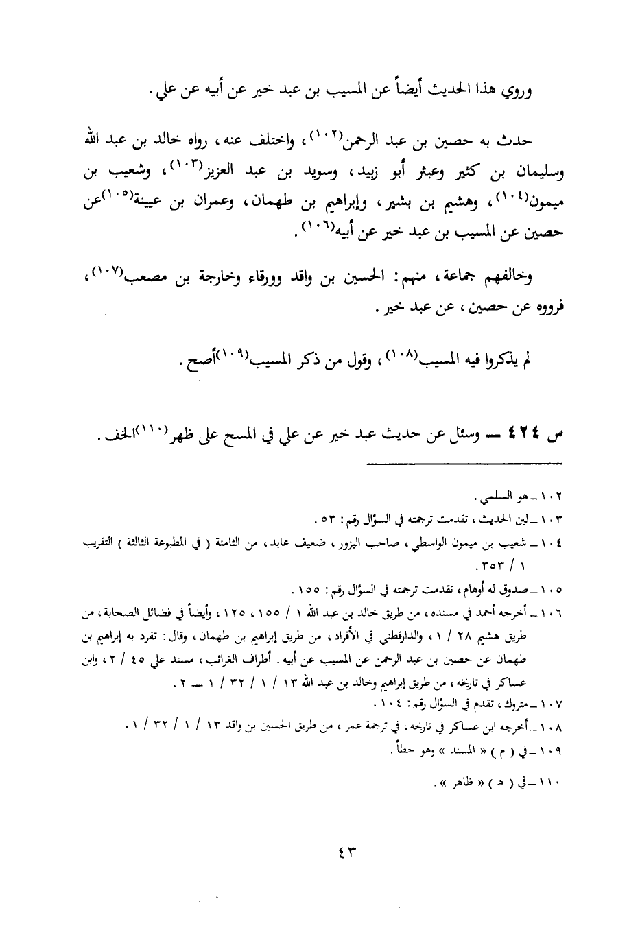 حَدَّثَ بِهِ حُصَيْنُ بْنُ عَبْدِ الرَّحَمْنِ وَاخْتُلِفَ عَنْهُ رَوَاهُ خَالِدُ بْنُ عَبْدِ اللَّهِ وَسُلَيْمَانُ بْنُ كَثِيرٍ وَعَبْثَرٌ أَبُو زُبَيْدٍ وَسُوَيْدُ بْنُ عَبْدِ الْعَزِيزِ وَشُعَيْبُ بْنُ مَيْمُونٍ، وَهُشَيْمُ بْنُ بَشِيرٍ وَإِبْرَاهِيمُ بْنُ طَهْمَانَ وَعِمْرَانُ بْنُ عُيَيْنَةَ عَنْ حُصَيْنٍ عَنِ الْمُسَيَّبِ بْنِ عَبْدِ خَيْرٍ عَنْ أَبِيهِ.