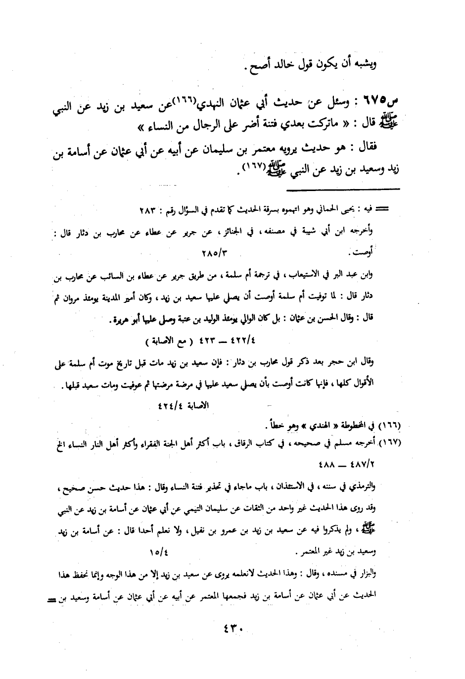 675- وَسُئِلَ عَنْ حَدِيثِ أَبِي عُثْمَانَ النَّهْدِيِّ، عَنْ سَعِيدِ بْنِ زَيْدٍ، عَنِ النَّبِيِّ صَلَّى اللَّهُ عَلَيْهِ وَسَلَّمَ، قَالَ: مَا تَرَكْتُ بَعْدِي فِتْنَةً أَضَرَّ عَلَى الرِّجَالِ مِنَ النِّسَاءِ.