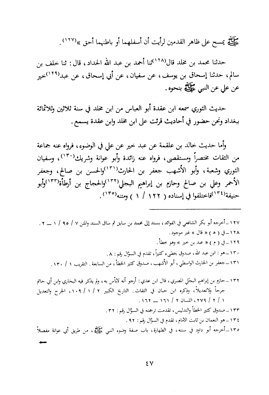 وَأَمَّا حَدِيثُ خَالِدِ بْنِ عَلْقَمَةَ، عَنْ عَبْدِ خَيْرٍ، عَنْ عَلِيٍّ فِي الْوُضُوءِ، فَرَوَاهُ عَنْهُ جَمَاعَةٌ مِنَ الثِّقَاتِ مُخْتَصَرًا وَمُسْتَقْصَى، فَرَوَاهُ عَنْهُ زَائِدَةُ، وَأَبُو عَوَانَةَ، وَشَرِيكٌ، وَسُفْيَانُ الثَّوْرِيُّ، وَشُعْبَةُ، وَأَبُو الْأَشْهَبِ جَعْفَرُ بْنُ الْحَارِثِ، وَالْحَسَنُ بْنُ صَالِحٍ، وَجَعْفَرٌ الْأَحْمَرُ، وَعَلِيُّ بْنُ صَالِحٍ، وَحَازِمُ بْنُ إِبْرَاهِيمَ الْبَجَلِيُّ، وَالْحَجَّاجُ بْنُ أَرْطَأَةَ، وَأَبُو حَنِيفَةَ، فَاخْتَلَفُوا فِي إِسْنَادِهِ وَمَتْنِهِ.