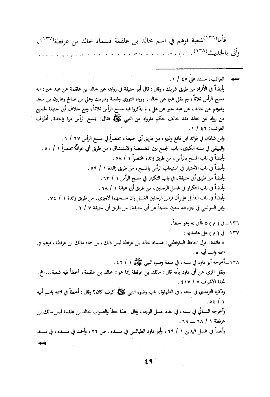 فَأَمَّا شُعْبَةُ فَوَهِمَ فِي اسْمِ خَالِدِ بْنِ عَلْقَمَةَ، فَسَمَّاهُ خَالِدَ بْنَ عَرْفَطَةَ، وَأَتَى بِالْحَدِيثِ ... وَأَغْرَبَ ابْنُ أَبِي عَدِيٍّ، عَنْ شُعْبَةَ، فِيهِ بِلَفْظَةٍ ذَكَرَهَا عَنْ سُفْيَانَ الثَّوْرِيِّ، عَنْ خَالِدٍ: غَسَلَ يَدَيْهِ ثَلَاثًا.