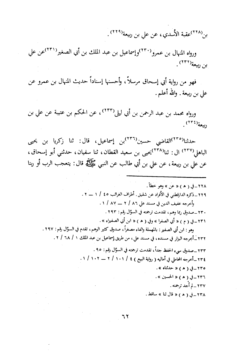 فَهُوَ مِنْ رِوَايَةِ أَبِي إِسْحَاقَ مُرْسَلًا وَأَحْسَنُهَا إِسْنَادًا حَدِيثُ الْمِنْهَالِ بْنِ عَمْرٍو، عَنْ عَلِيِّ بْنِ رَبِيعَةَ وَاللَّهُ أَعْلَمُ.