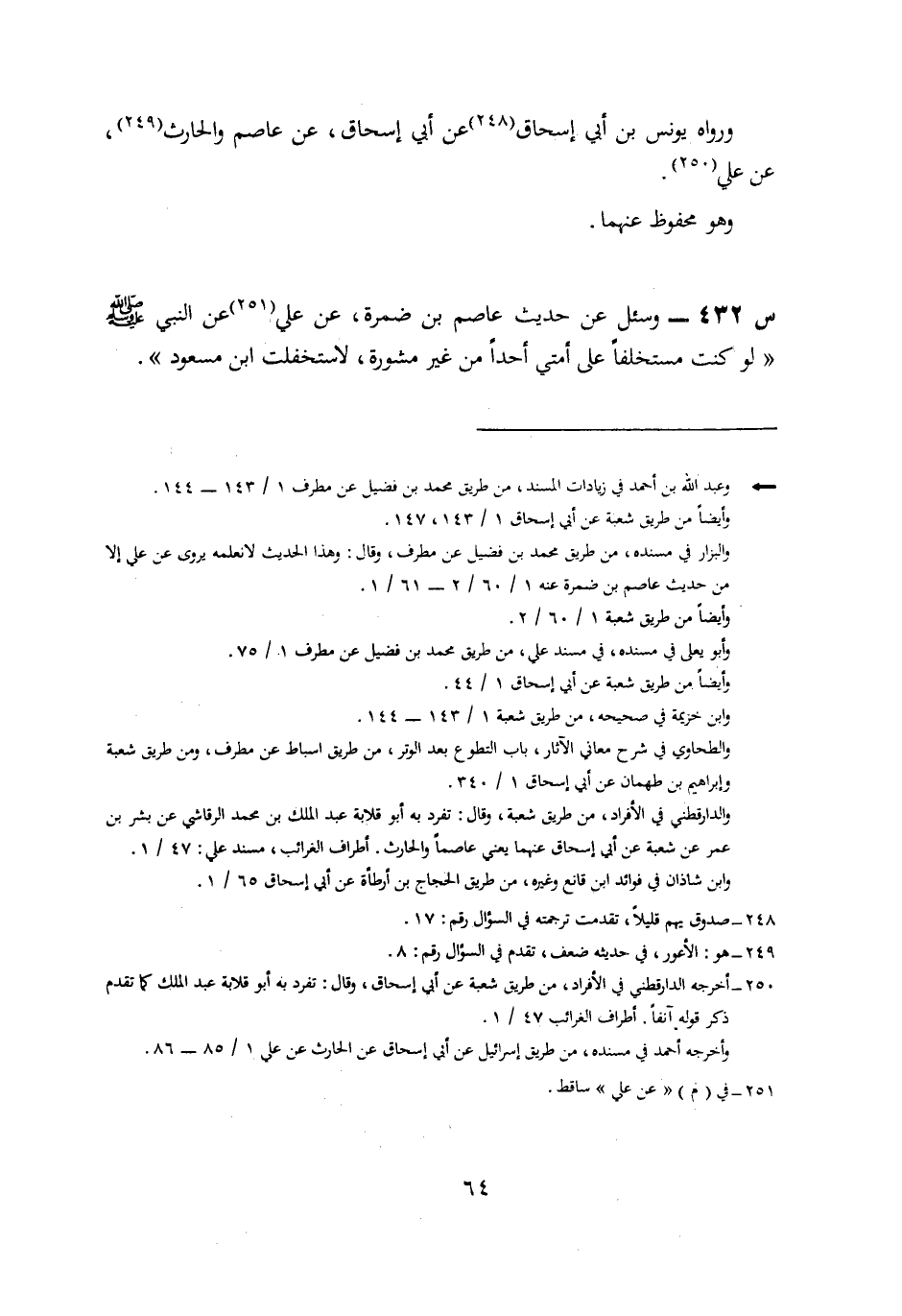 432- وَسُئِلَ عَنْ حَدِيثِ عَاصِمِ بْنِ ضَمْرَةَ، عَنْ عَلِيٍّ، عَنِ النَّبِيِّ صَلَّى اللَّهُ عَلَيْهِ وسلم: لَوْ كُنْتُ مُسْتَخْلِفًا عَلَى أُمَّتِي أَحَدًا مِنْ غَيْرِ مَشُورَةٍ، لَاسْتَخْلَفْتُ ابْنَ مَسْعُودٍ.