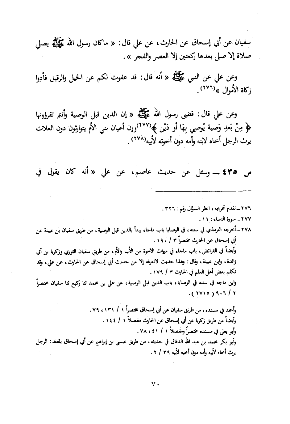 وَعَنْ عَلِيٍّ، قَالَ: قَضَى رَسُولُ اللَّهِ صَلَّى اللَّهُ عَلَيْهِ وَسَلَّمَ: إن الدين قبل الوصية، وأنتم تقرؤونها: {مِنْ بَعْدِ وَصِيَّةٍ يُوصِي بِهَا أَوْ دَيْنٍ} وَإِنَّ أَعْيَانَ بَنِي الْأُمِّ يَتَوَارَثُونَ دُونَ الْعَلَّاتِ، يَرِثُ الرَّجُلُ أَخَاهُ لِابْنِهِ وَأُمِّهِ دُونَ إِخْوَتِهِ لأبيه.