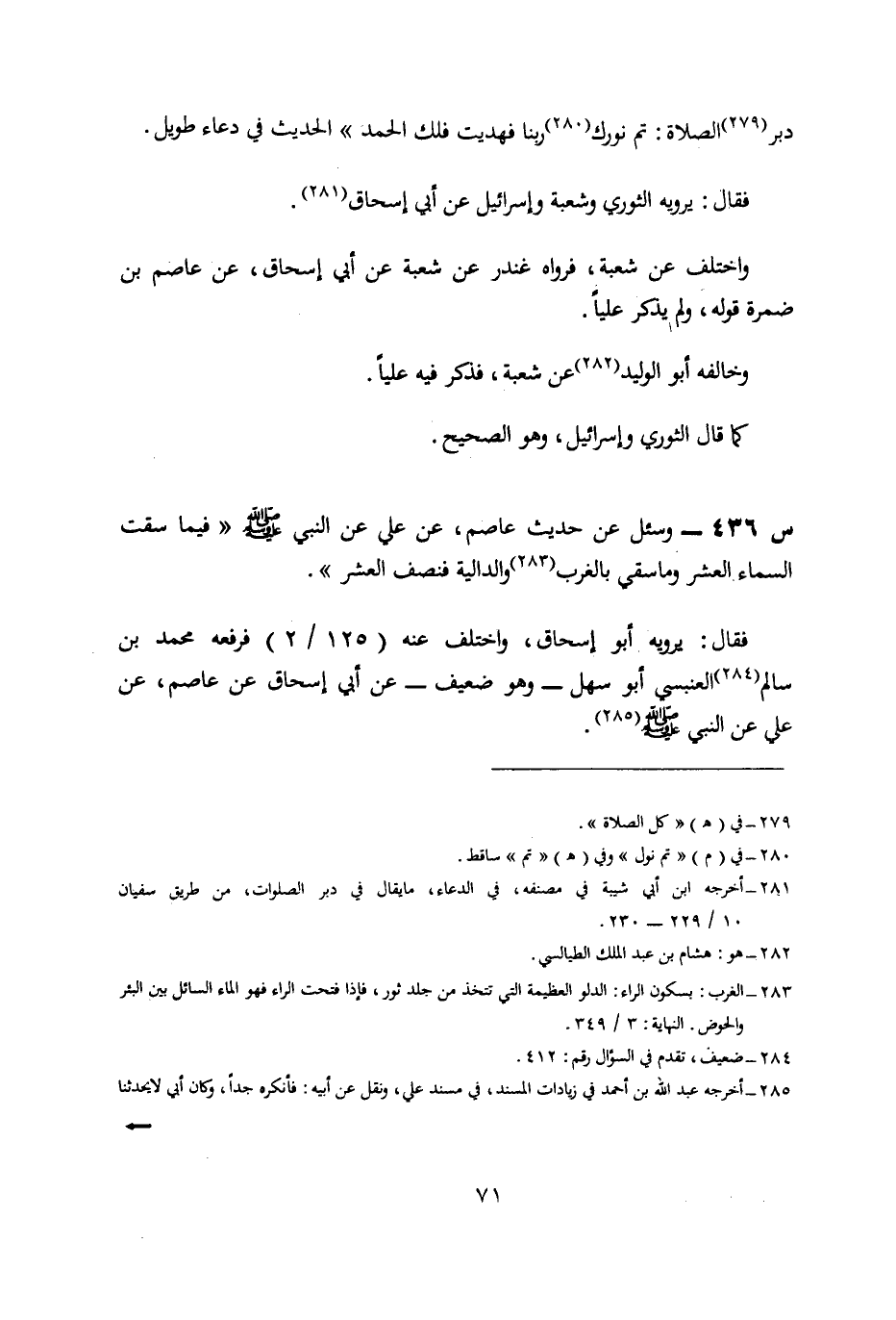 435- وَسُئِلَ عَنْ حَدِيثِ عَاصِمٍ، عَنْ عَلِيٍّ أَنَّهُ كان يقول في دبر الصلاة ثم نُورُكُ رَبَّنَا فَهَدَيْتَ فَلَكَ الْحَمْدُ الْحَدِيثَ فِي دُعَاءٍ طَوِيلٍ.