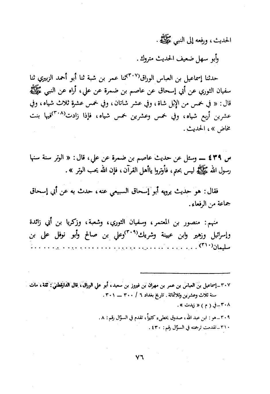439- وَسُئِلَ عَنْ حَدِيثِ عَاصِمِ بْنِ ضَمْرَةَ، عَنْ عَلِيٍّ، قَالَ الْوِتْرُ سُنَّةُ سَنَّهَا رَسُولُ اللَّهِ صَلَّى اللَّهُ عَلَيْهِ وَسَلَّمَ لَيْسَ بِحَتْمٍ، فَأَوْتِرُوا يَا أَهْلَ الْقُرْآنِ، فَإِنَّ اللَّهَ يُحِبُّ الْوِتْرَ.