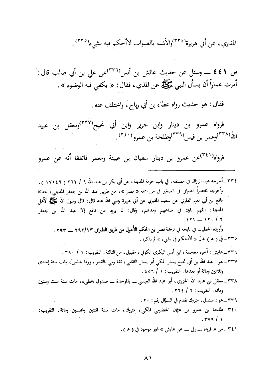 441- وَسُئِلَ عَنْ حَدِيثِ عَائِشِ بْنِ أَنَسٍ، عَنْ عَلِيِّ بْنِ أَبِي طَالِبٍ، قَالَ أَمَرْتُ عَمَّارًا أَنْ يَسْأَلَ النَّبِيَّ صَلَّى اللَّهُ عَلَيْهِ وَسَلَّمَ عَنِ الْمَذْيِ، فَقَالَ: يَكْفِي فِيهِ الْوُضُوءُ.