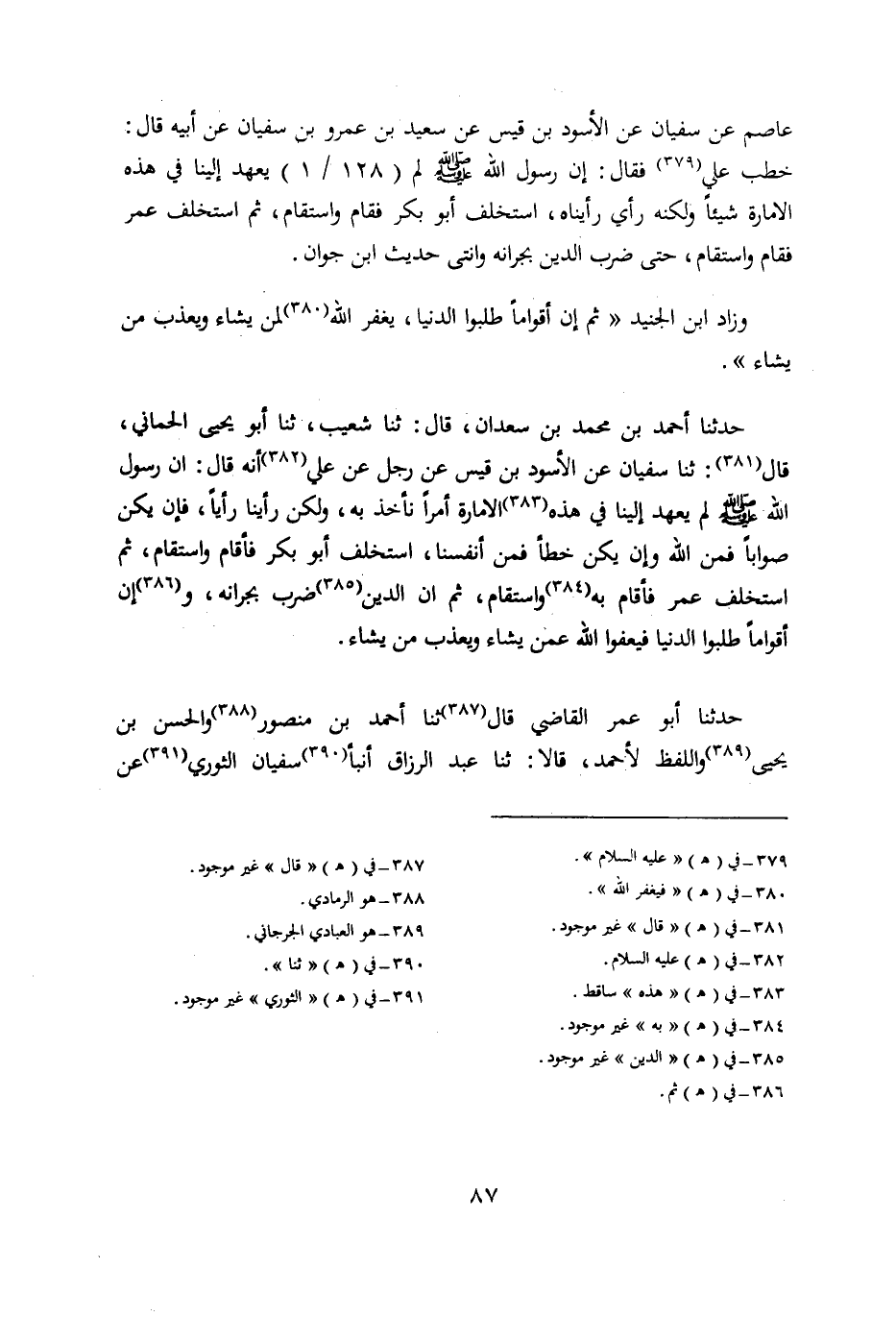 حَدَّثَنَا أَحْمَدُ بْنُ محمد بن سعدان، قال: حدثنا شعيب حدثنا أبو يحيى الحماني، قال: حدثنا سُفْيَانُ، عَنِ الْأَسْوَدِ بْنِ قَيْسٍ عَنْ رَجُلٍ، عَنْ عَلِيٍّ أَنَّهُ قَالَ أَنَّ رَسُولَ اللَّهِ صَلَّى اللَّهُ عَلَيْهِ وَسَلَّمَ لَمْ يَعْهَدْ إِلَيْنَا فِي هَذِهِ الْإِمَارَةِ أَمْرًا نَأْخُذُ بِهِ وَلَكِنْ رَأَيْنَا رَأْيًا فَإِنْ يَكُنْ صَوَابًا فَمِنَ اللَّهِ وإن يكن خطأ فَمِنْ أَنْفُسِنَا اسْتُخْلِفَ أَبُو بَكْرٍ فَأَقَامَ وَاسْتَقَامُ ثم استخلف عمر فأقام به واستقام ثم إن الدين ضرب بجرانه وإن أَقْوَامًا طَلَبُوا الدُّنْيَا فَيَعْفُوا اللَّهُ عَمَّنْ يَشَاءُ وَيُعَذِّبُ مَنْ يَشَاءُ.