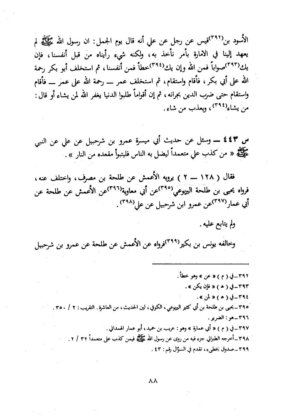 443- وَسُئِلَ عَنْ حَدِيثِ أَبِي مَيْسَرَةَ عَمْرِو بْنِ شُرَحْبِيلَ، عَنْ عَلِيٍّ، عَنِ النَّبِيِّ صَلَّى اللَّهُ عَلَيْهِ وَسَلَّمَ: مَنْ كَذِبَ عَلَيَّ مُتَعَمِّدًا لِيُضِلَّ بِهِ النَّاسَ، فَلْيَتَبَوَّأْ مَقْعَدَهُ مِنَ النَّارِ.