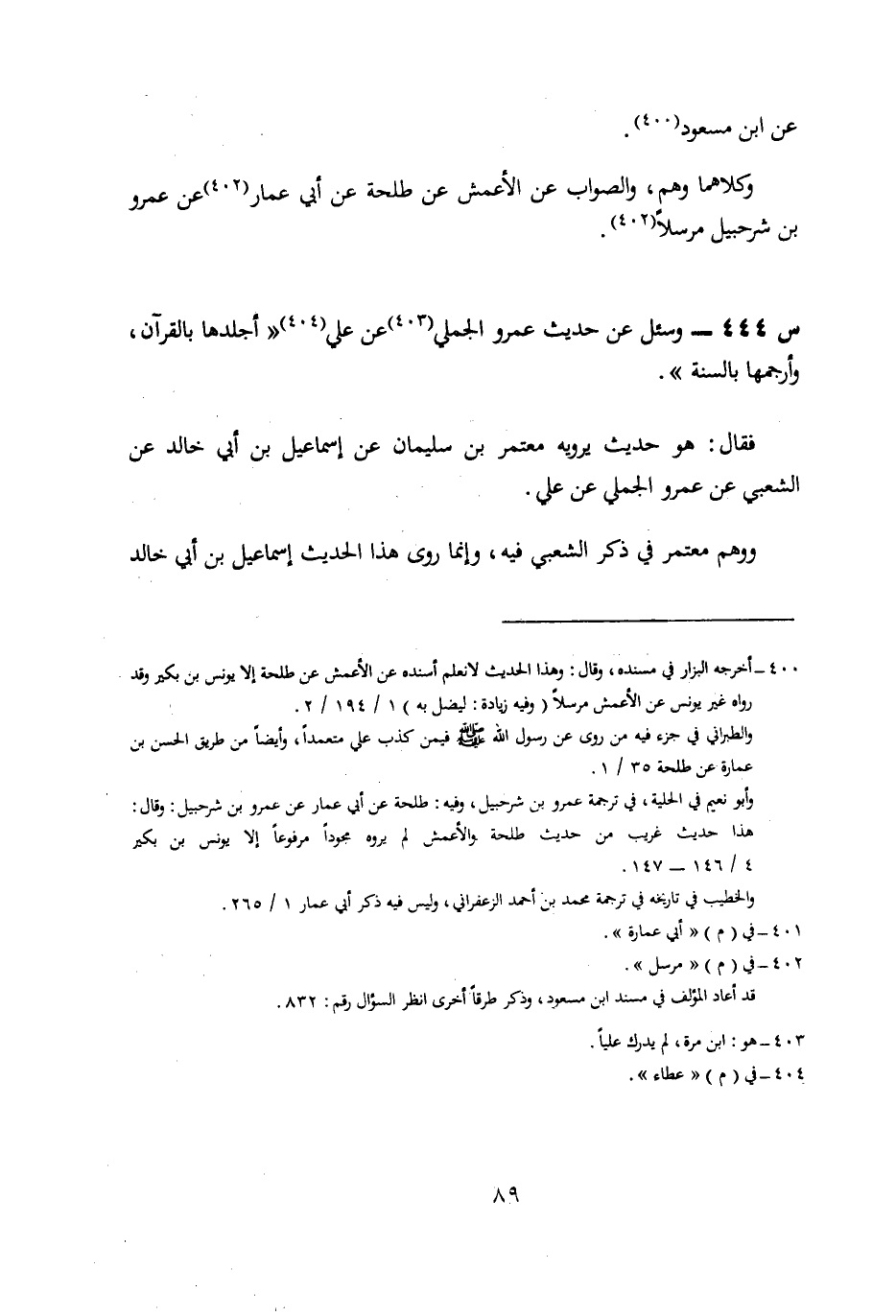 444- وَسُئِلَ عَنْ حَدِيثِ عَمْرٍو الْجَمَلِيِّ، عَنْ عَلِيٍّ أَجْلِدُهَا بِالْقُرْآنِ وَأَرْجُمُهَا بِالسُّنَّةِ.